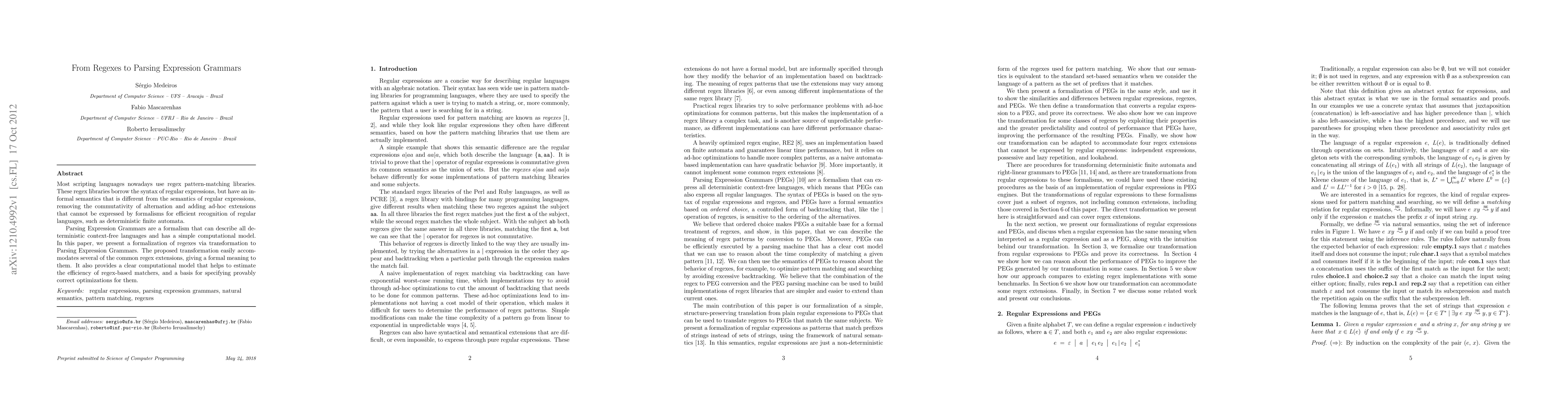 This paper proposes transforming regexes into Parsing Expression Grammars (PEGs) to provide a formal semantics for regexes, accommodating common extensions and offering a clear computational model for assessing matcher efficiency and specifying optimizations.
