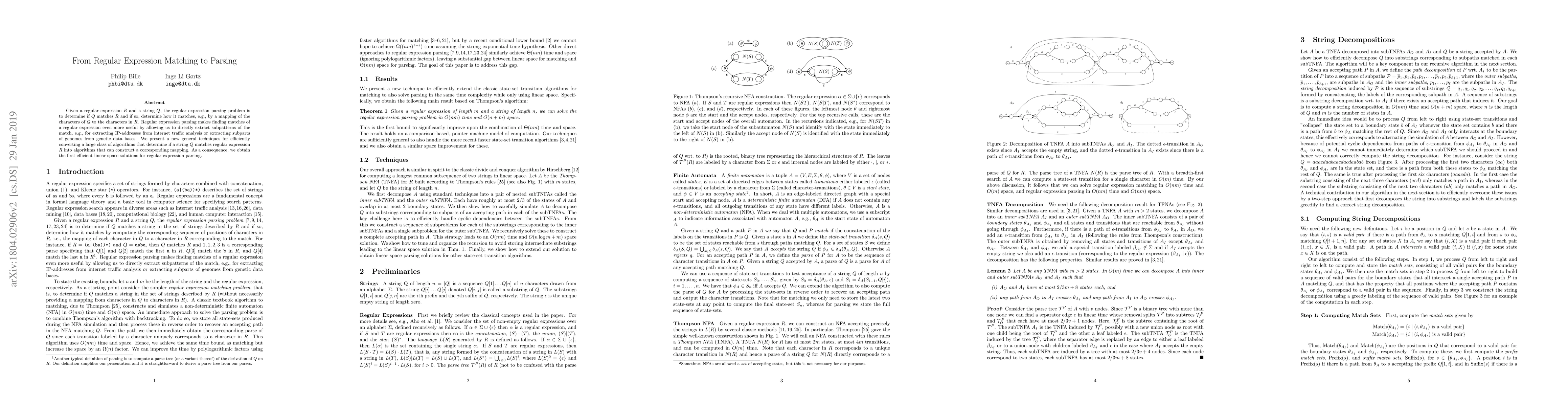 This paper introduces new techniques for converting regular expression matching algorithms into parsing algorithms that construct mappings between string characters and regular expression components, enabling efficient extraction of subpatterns. The authors present the first linear space solutions for regular expression parsing, applicable in fields like internet traffic and genetic data analysis.