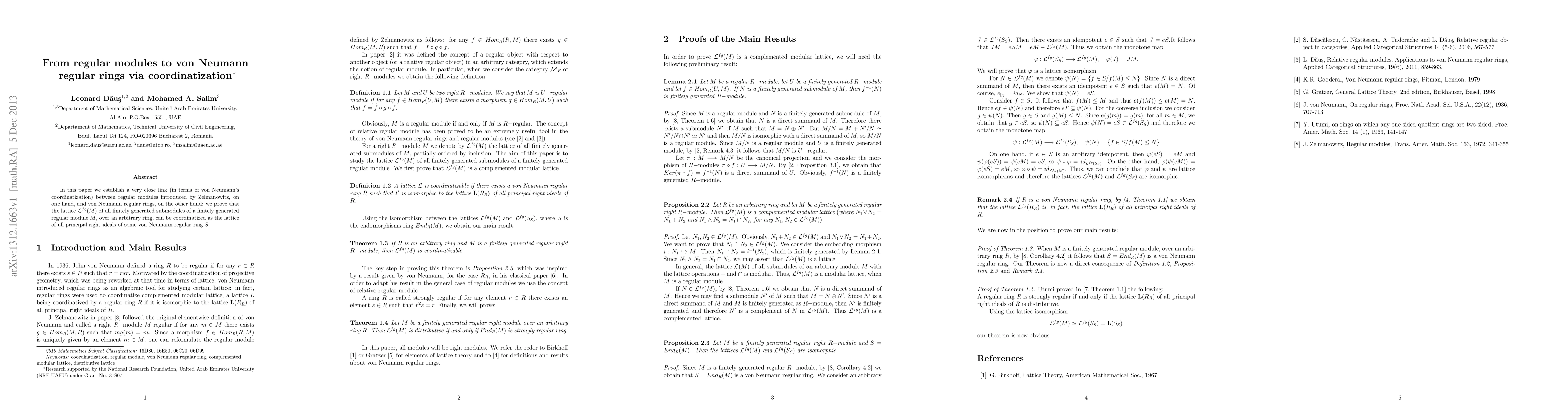 This paper establishes a strong connection between regular modules and von Neumann regular rings through von Neumann's coordinatization, proving that the lattice of finitely generated submodules of a finitely generated regular module can be viewed as the lattice of principal right ideals of a von Neumann regular ring.