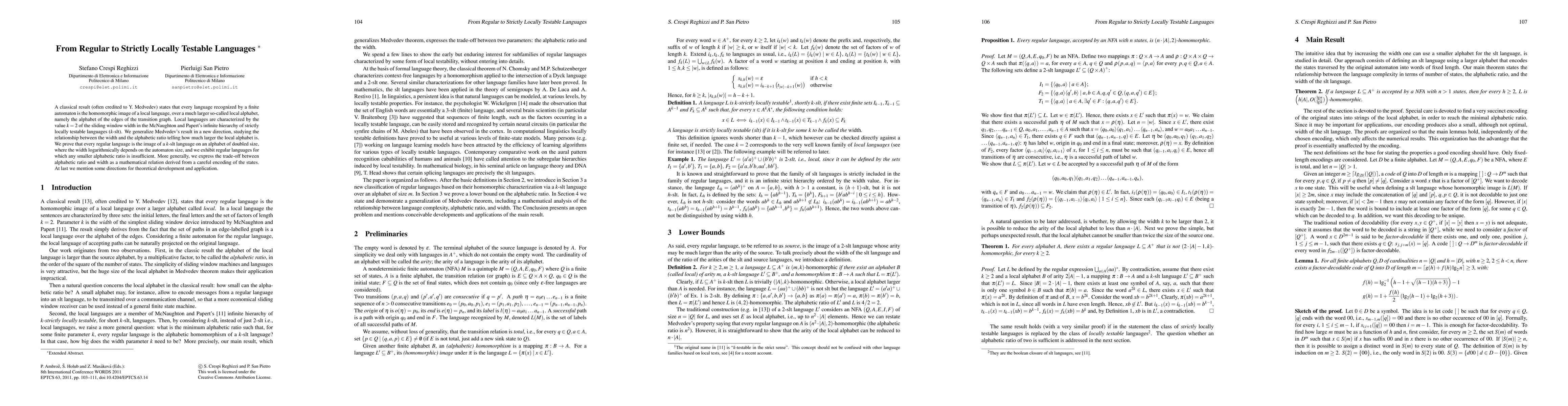 A classical result (often credited to Y. Medvedev) states that every language recognized by a finite automaton is the homomorphic image of a local language, over a much larger so-called local alphabet, namely the alphabet of the edges of the transition graph. Local languages are characterized by the value k=2 of the sliding window width in the McNaughton and Papert's infinite hierarchy of strictly locally testable languages (k-slt). We generalize Medvedev's result in a new direction, studying the relationship between the width and the alphabetic ratio telling how much larger the local alphabet is. We prove that every regular language is the image of a k-slt language on an alphabet of doubled size, where the width logarithmically depends on the automaton size, and we exhibit regular languages for which any smaller alphabetic ratio is insufficient. More generally, we express the trade-off between alphabetic ratio and width as a mathematical relation derived from a careful encoding of the states. At last we mention some directions for theoretical development and application.