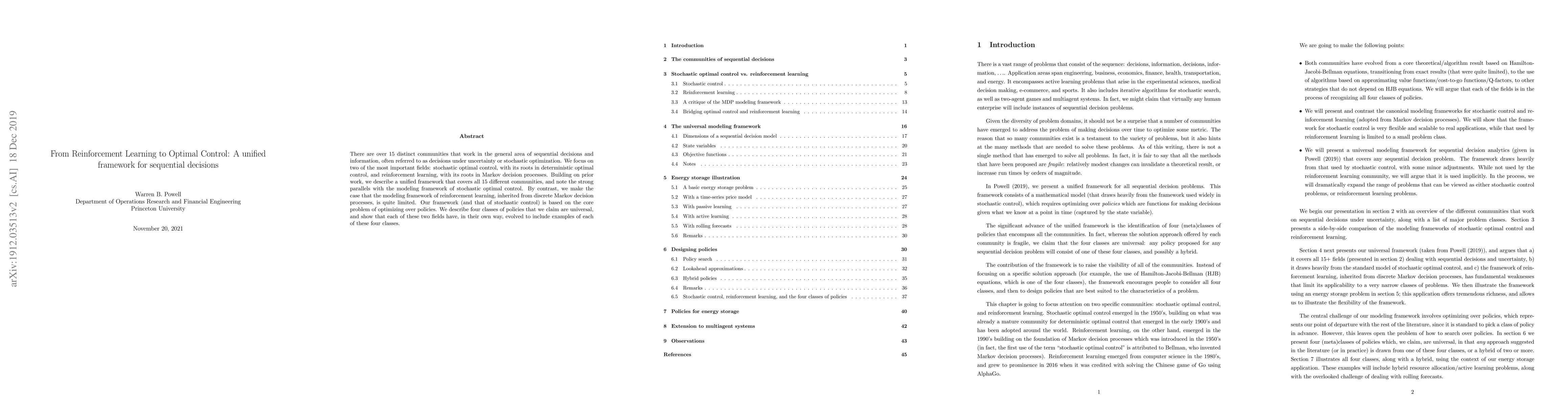This paper presents a unified framework that integrates the 15 distinct communities of sequential decision-making, emphasizing the parallels between stochastic optimal control and reinforcement learning. It argues that while reinforcement learning is rooted in limited Markov decision processes, the optimal control framework offers a more comprehensive approach to policy optimization.