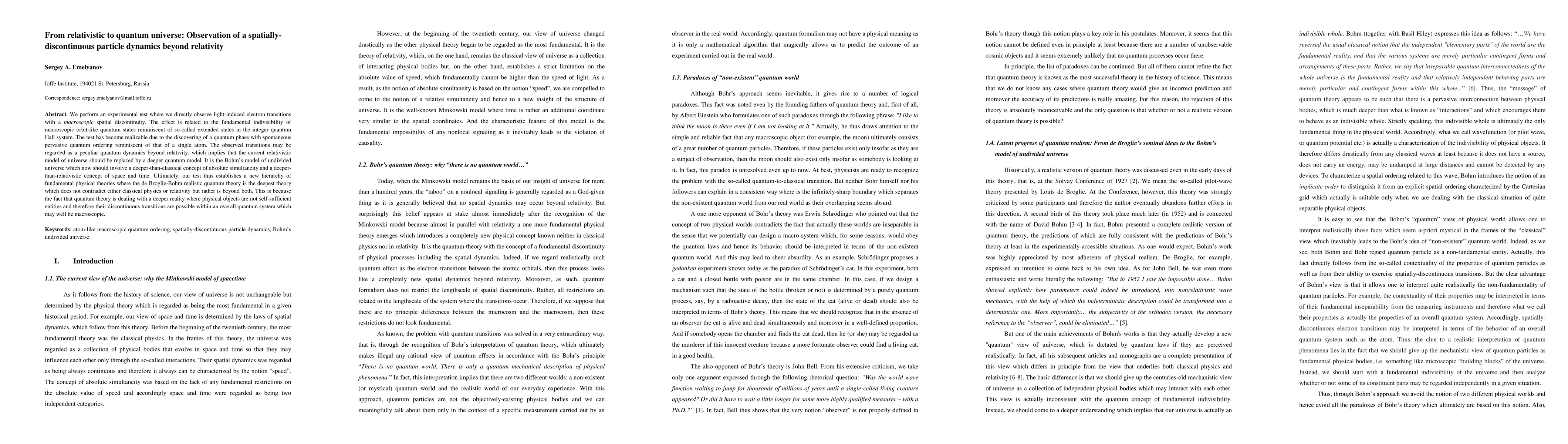 We perform an experimental test where we directly observe light-induced electron transitions with a macroscopic spatial discontinuity. The effect is related to the fundamental indivisibility of macroscopic orbit-like quantum states reminiscent of so-called extended states in the integer quantum Hall system. The test has become realizable due to the discovering of a quantum phase with spontaneous pervasive quantum ordering reminiscent of that of a single atom. The observed transitions may be regarded as a peculiar quantum dynamics beyond relativity, which implies that the current relativistic model of universe should be replaced by a deeper quantum model. It is the Bohm's model of undivided universe, which now should involve a deeper-than-classical concept of absolute simultaneity and a deeper-than-relativistic concept of space and time. Ultimately, our test thus establishes a new hierarchy of fundamental physical theories where the de Broglie-Bohm realistic quantum theory is the deepest theory which does not contradict either classical physics or relativity but rather is beyond both. This is because the fact that quantum theory is dealing with a deeper reality where physical objects are not self-sufficient entities and therefore their discontinuous transitions are possible within an overall quantum system which may well be macroscopic.