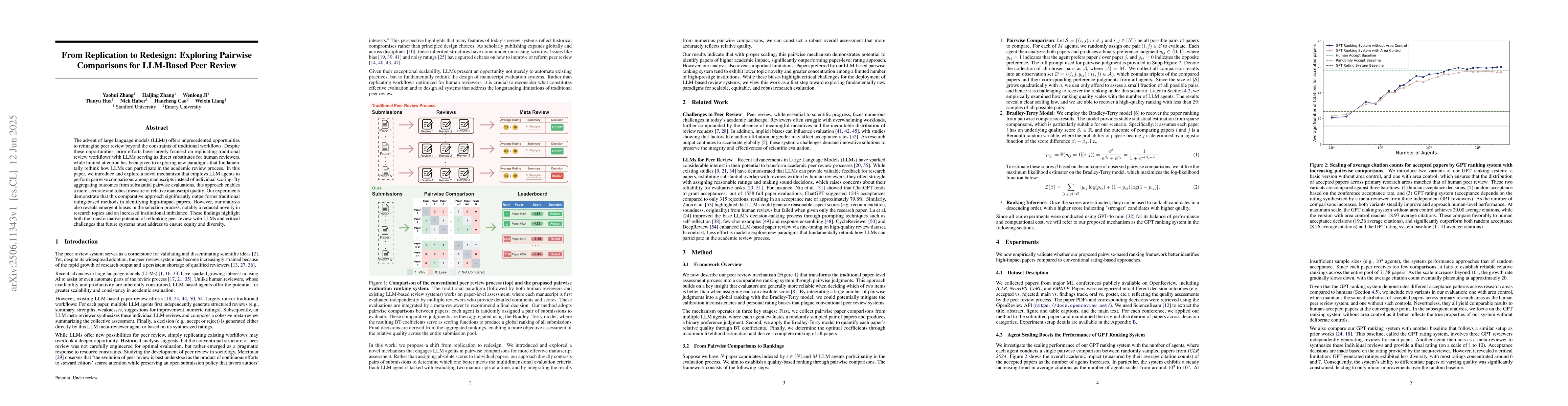 The paper presents a pairwise comparison mechanism for LLM-based peer review, demonstrating its effectiveness in identifying high-impact papers across multiple conferences.