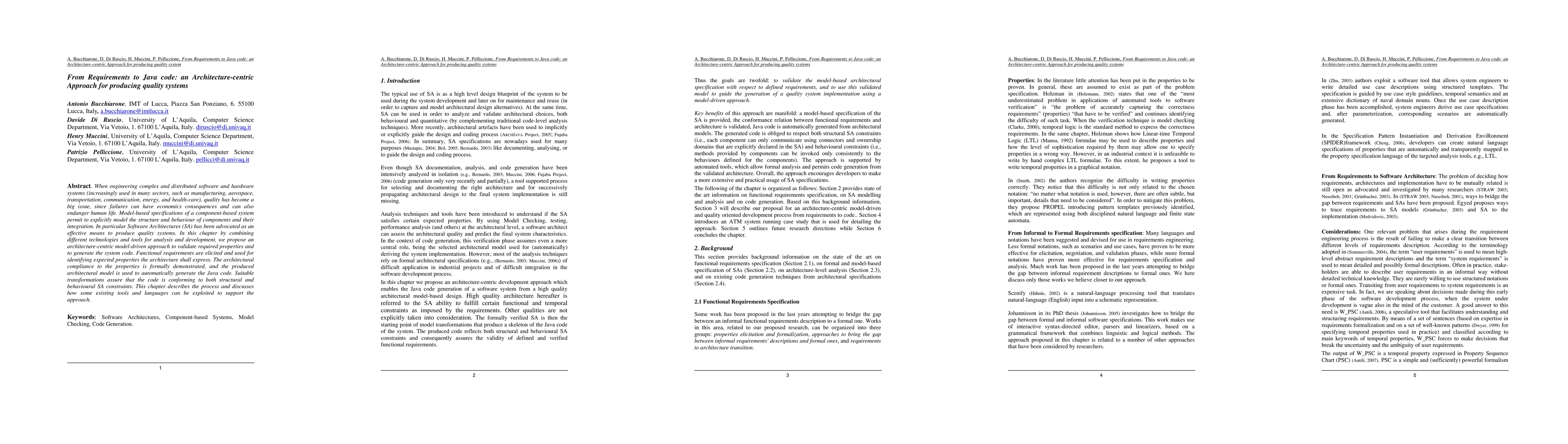 When engineering complex and distributed software and hardware systems (increasingly used in many sectors, such as manufacturing, aerospace, transportation, communication, energy, and health-care), quality has become a big issue, since failures can have economics consequences and can also endanger human life. Model-based specifications of a component-based system permit to explicitly model the structure and behaviour of components and their integration. In particular Software Architectures (SA) has been advocated as an effective means to produce quality systems. In this chapter by combining different technologies and tools for analysis and development, we propose an architecture-centric model-driven approach to validate required properties and to generate the system code. Functional requirements are elicited and used for identifying expected properties the architecture shall express. The architectural compliance to the properties is formally demonstrated, and the produced architectural model is used to automatically generate the Java code. Suitable transformations assure that the code is conforming to both structural and behavioural SA constraints. This chapter describes the process and discusses how some existing tools and languages can be exploited to support the approach.