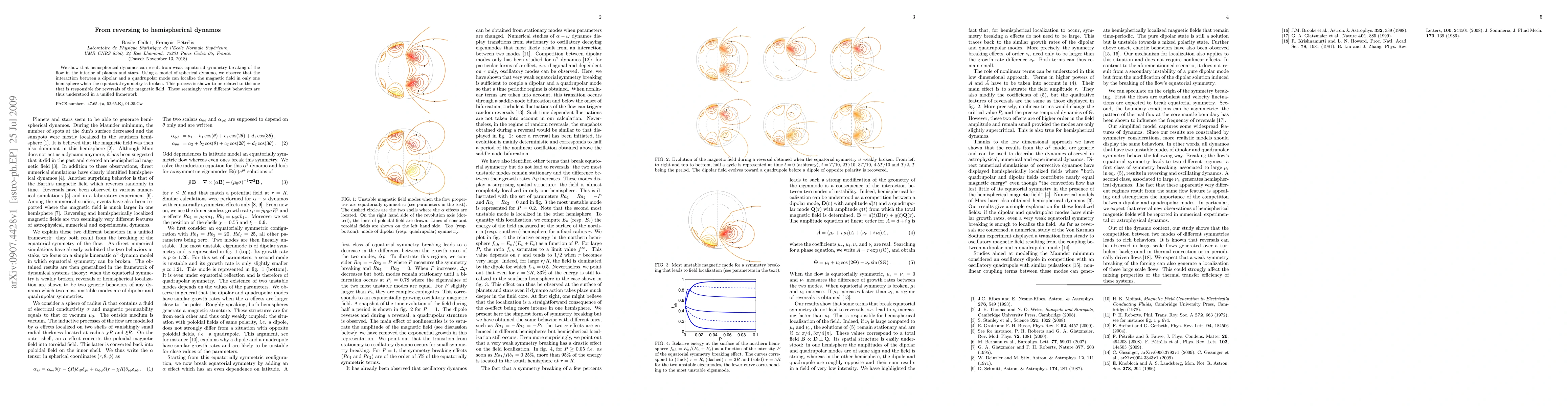 We show that hemispherical dynamos can result from weak equatorial symmetry breaking of the flow in the interior of planets and stars. Using a model of spherical dynamo, we observe that the interaction between a dipolar and a quadrupolar mode can localize the magnetic field in only one hemisphere when the equatorial symmetry is broken. This process is shown to be related to the one that is responsible for reversals of the magnetic field. These seemingly very different behaviors are thus understood in a unified framework.