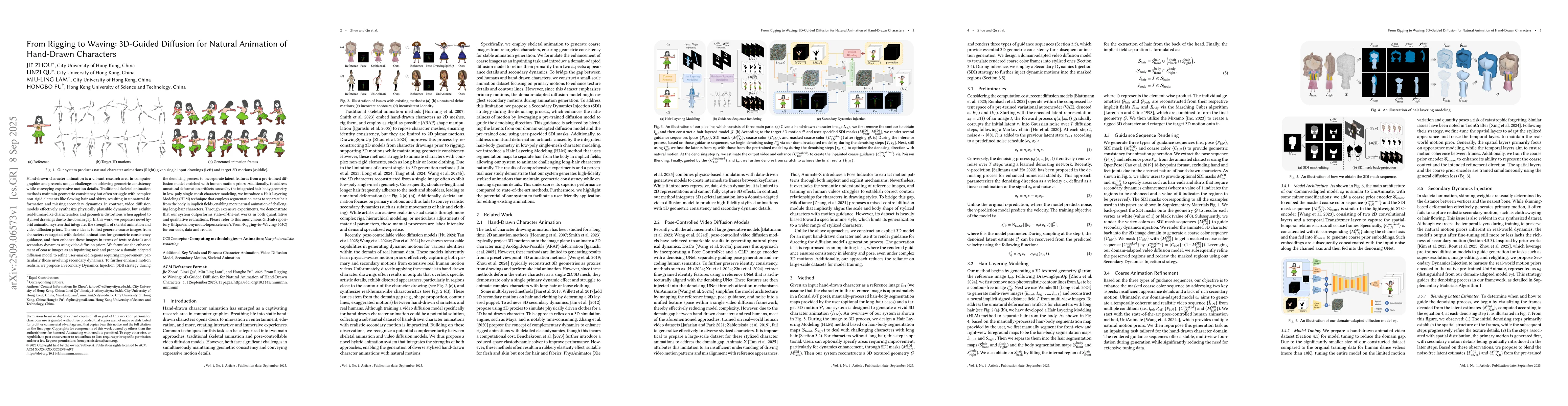Hand-drawn character animation is a vibrant field in computer graphics, presenting challenges in achieving geometric consistency while conveying expressive motion. Traditional skeletal animation methods maintain geometric consistency but struggle with complex non-rigid elements like flowing hair and skirts, leading to unnatural deformation. Conversely, video diffusion models synthesize realistic dynamics but often create geometric distortions in stylized drawings due to domain gaps. This work proposes a hybrid animation system that combines skeletal animation and video diffusion. Initially, coarse images are generated from characters retargeted with skeletal animations for geometric guidance. These images are then enhanced in texture and secondary dynamics using video diffusion priors, framing this enhancement as an inpainting task. A domain-adapted diffusion model refines user-masked regions needing improvement, especially for secondary dynamics. To enhance motion realism further, we introduce a Secondary Dynamics Injection (SDI) strategy in the denoising process, incorporating features from a pre-trained diffusion model enriched with human motion priors. Additionally, to tackle unnatural deformations from low-poly single-mesh character modeling, we present a Hair Layering Modeling (HLM) technique that uses segmentation maps to separate hair from the body, allowing for more natural animation of long-haired characters. Extensive experiments show that our system outperforms state-of-the-art methods in both quantitative and qualitative evaluations.