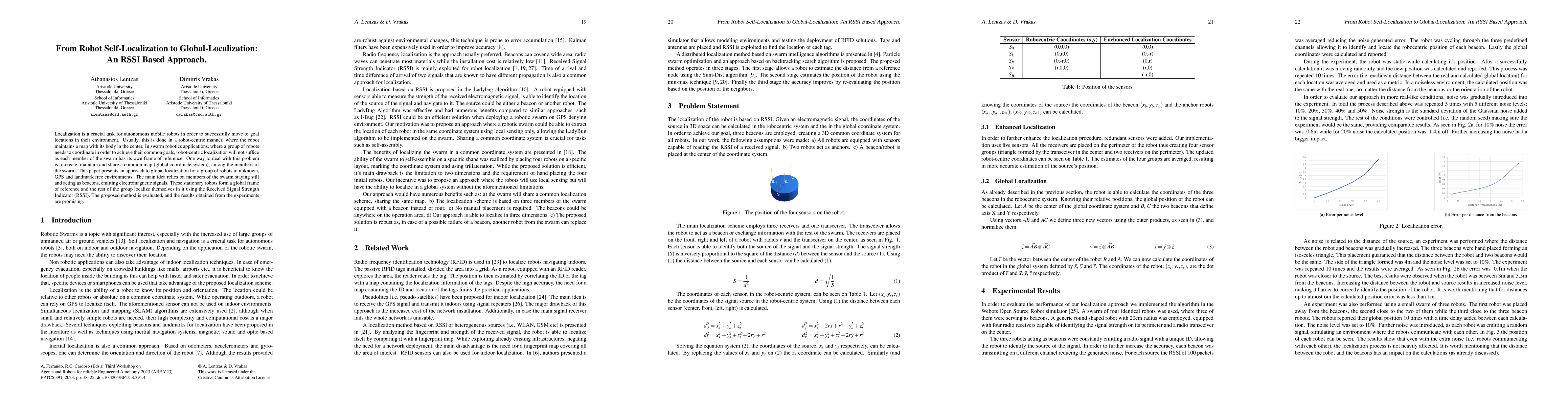 Localization is a crucial task for autonomous mobile robots in order to successfully move to goal locations in their environment. Usually, this is done in a robot-centric manner, where the robot maintains a map with its body in the center. In swarm robotics applications, where a group of robots needs to coordinate in order to achieve their common goals, robot-centric localization will not suffice as each member of the swarm has its own frame of reference. One way to deal with this problem is to create, maintain and share a common map (global coordinate system), among the members of the swarm. This paper presents an approach to global localization for a group of robots in unknown, GPS and landmark free environments that extends the localization scheme of the LadyBug algorithm. The main idea relies on members of the swarm staying still and acting as beacons, emitting electromagnetic signals. These stationary robots form a global frame of reference and the rest of the group localize themselves in it using the Received Signal Strength Indicator (RSSI). The proposed method is evaluated, and the results obtained from the experiments are promising.