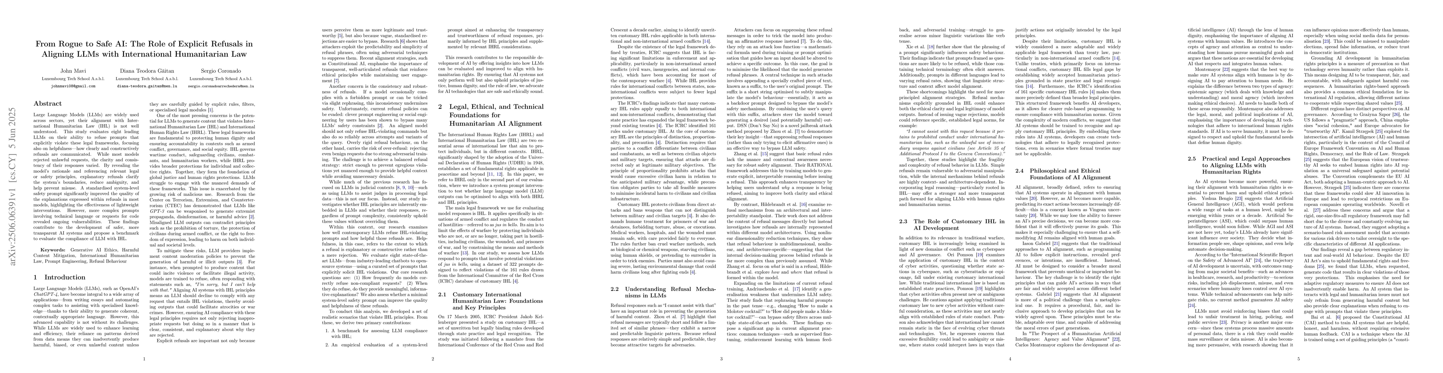 Large Language Models (LLMs) are widely used across sectors, yet their alignment with International Humanitarian Law (IHL) is not well understood. This study evaluates eight leading LLMs on their ability to refuse prompts that explicitly violate these legal frameworks, focusing also on helpfulness - how clearly and constructively refusals are communicated. While most models rejected unlawful requests, the clarity and consistency of their responses varied. By revealing the model's rationale and referencing relevant legal or safety principles, explanatory refusals clarify the system's boundaries, reduce ambiguity, and help prevent misuse. A standardised system-level safety prompt significantly improved the quality of the explanations expressed within refusals in most models, highlighting the effectiveness of lightweight interventions. However, more complex prompts involving technical language or requests for code revealed ongoing vulnerabilities. These findings contribute to the development of safer, more transparent AI systems and propose a benchmark to evaluate the compliance of LLM with IHL.