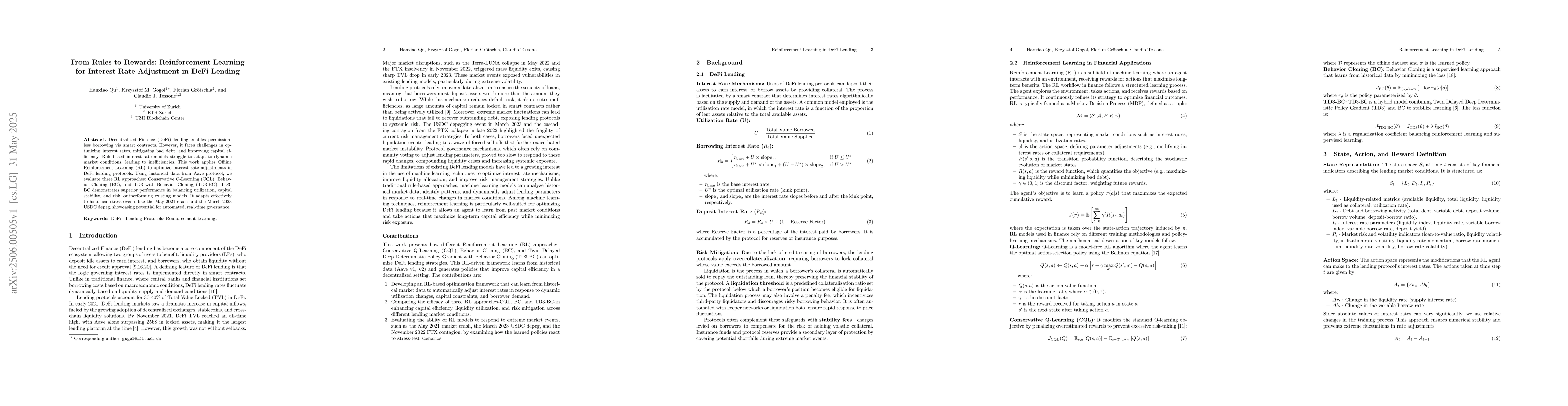 This paper applies reinforcement learning to optimize interest rates in DeFi lending protocols, outperforming existing models and demonstrating potential for automated real-time governance.