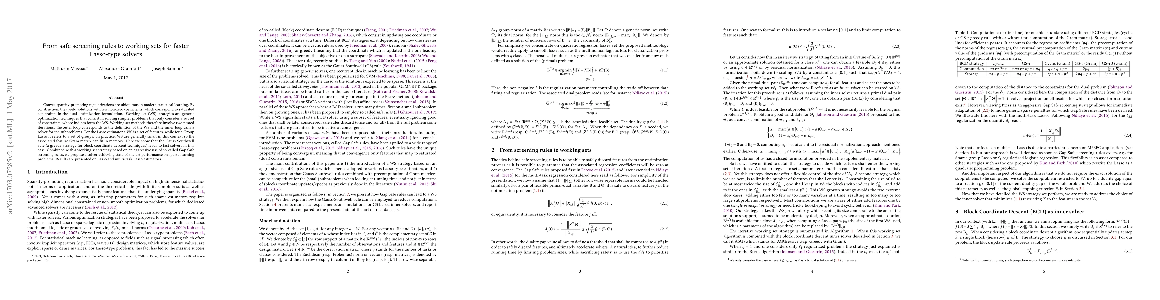 The paper proposes a connection between Gap Safe screening rules and working set (WS) strategies, specifically for generic learning problems under sparsity assumptions. It analyzes block coordinate descent (BCD) variants used as inner solvers for WS methods, demonstrating the benefits of precomputing the Gram matrix in such contexts.