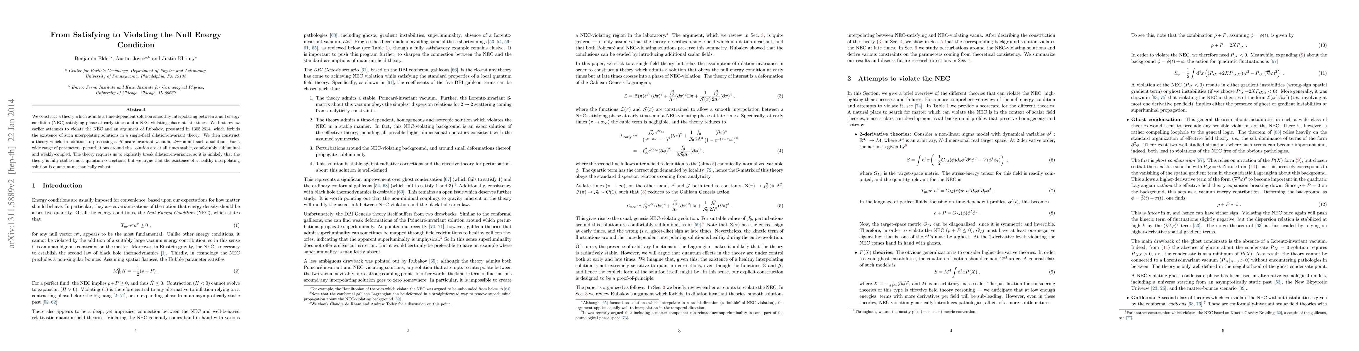 We construct a theory which admits a time-dependent solution smoothly interpolating between a null energy condition (NEC)-satisfying phase at early times and a NEC-violating phase at late times. We first review earlier attempts to violate the NEC and an argument of Rubakov, presented in 1305.2614, which forbids the existence of such interpolating solutions in a single-field dilation-invariant theory. We then construct a theory which, in addition to possessing a Poincar\'e-invariant vacuum, does admit such a solution. For a wide range of parameters, perturbations around this solution are at all times stable, comfortably subluminal and weakly-coupled. The theory requires us to explicitly break dilation-invariance, so it is unlikely that the theory is fully stable under quantum corrections, but we argue that the existence of a healthy interpolating solution is quantum-mechanically robust.
