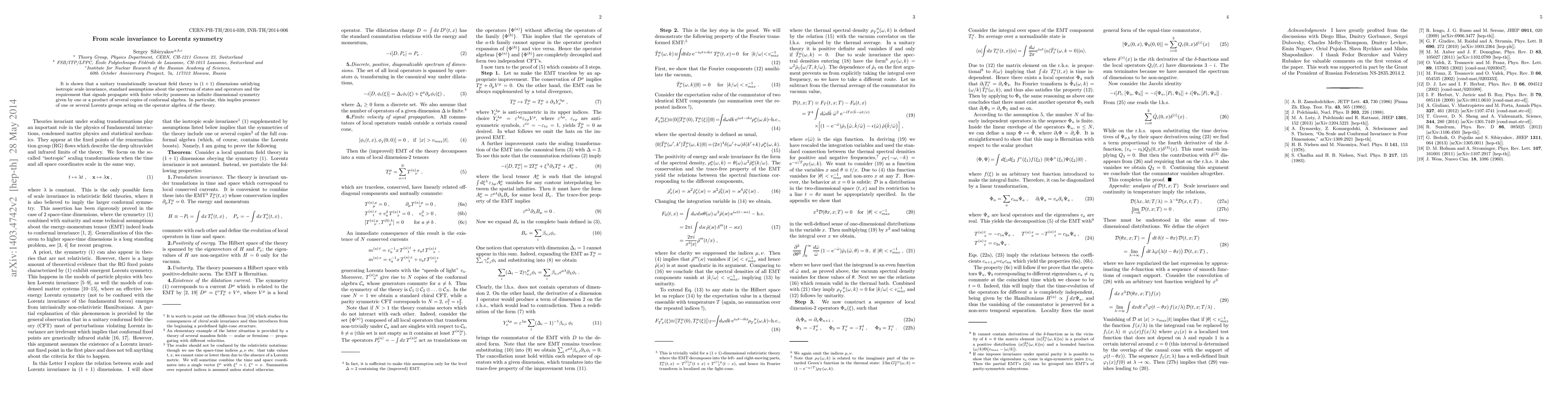 It is shown that a unitary translationally invariant field theory in (1+1) dimensions satisfying isotropic scale invariance, standard assumptions about the spectrum of states and operators and the requirement that signals propagate with finite velocity possesses an infinite dimensional symmetry given by one or a product of several copies of conformal algebra. In particular, this implies presence of one or several Lorentz groups acting on the operator algebra of the theory.