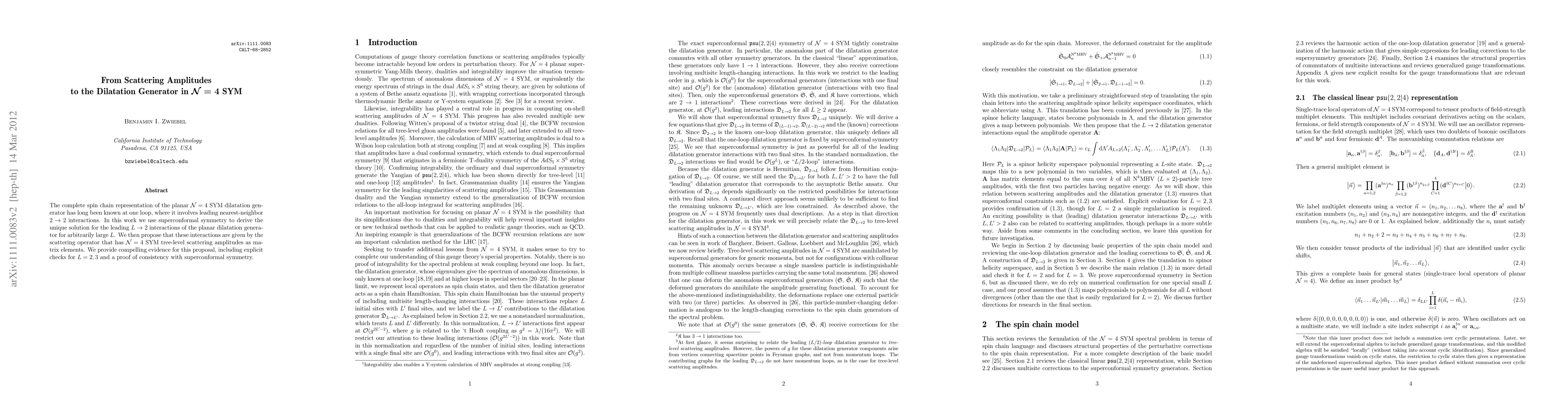 This paper derives the leading L → 2 interactions for the planar N=4 SYM dilatation generator using superconformal symmetry, proposing these interactions are represented by N=4 SYM tree-level scattering amplitudes. It provides evidence through checks for small values of L and proves consistency with superconformal symmetry.