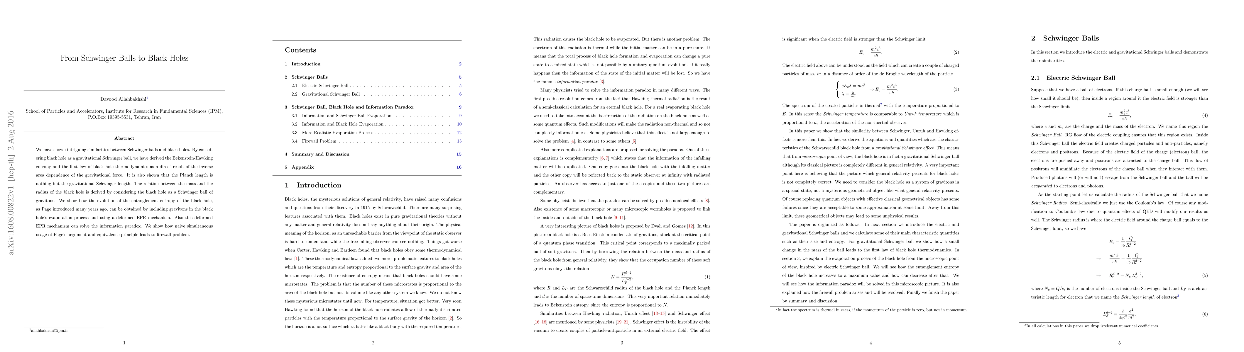 We have shown intriguing similarities between Schwinger balls and black holes. By considering black hole as a gravitational Schwinger ball, we have derived the Bekenstein-Hawking entropy and the first law of black hole thermodynamics as a direct result of the inverse area dependence of the gravitational force. It is also shown that the Planck length is nothing but the gravitational Schwinger length. The relation between the mass and the radius of the black hole is derived by considering the black hole as a Schwinger ball of gravitons. We show how the evolution of the entanglement entropy of the black hole, as Page introduced many years ago, can be obtained by including gravitons in the black hole's evaporation process and using a deformed EPR mechanism. Also this deformed EPR mechanism can solve the information paradox. We show how naive simultaneous usage of Page's argument and equivalence principle leads to firewall problem.
