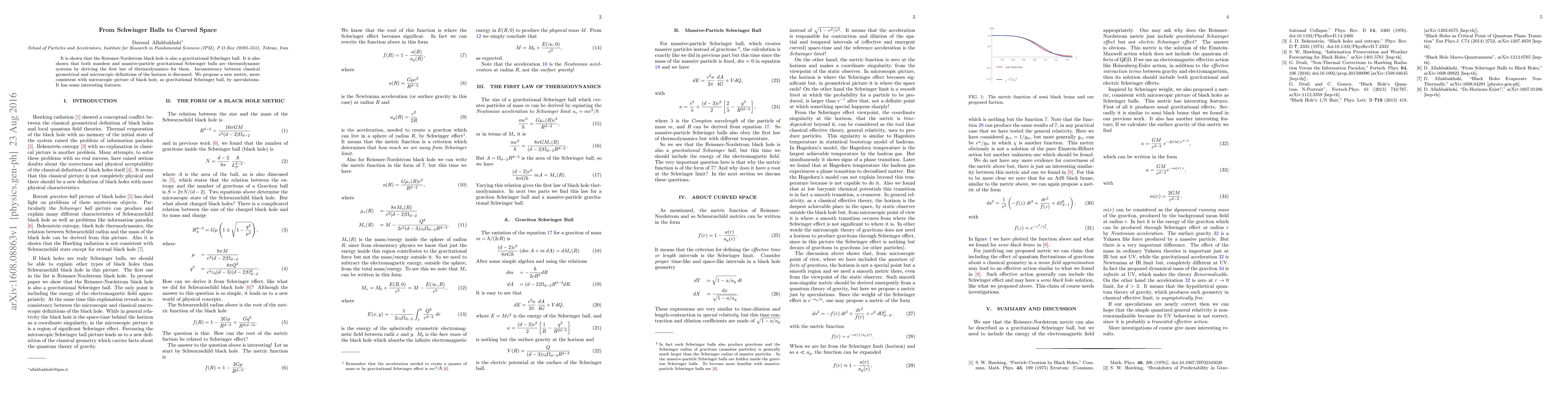The paper establishes that the Reissner-Nordstrom black hole is a gravitational Schwinger ball, demonstrating that both massless and massive-particle gravitational Schwinger balls are thermodynamic systems. It proposes a new, microscopically consistent metric for black holes, addressing inconsistencies between classical and microscopic horizon definitions.