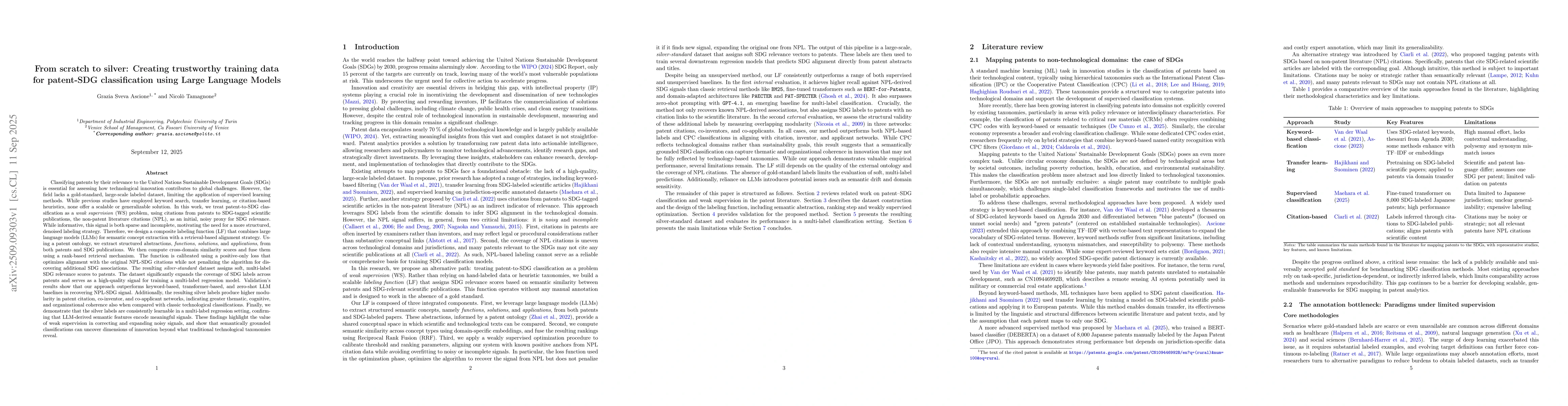Classifying patents by their relevance to the UN Sustainable Development Goals (SDGs) is crucial for tracking how innovation addresses global challenges. However, the absence of a large, labeled dataset limits the use of supervised learning. Existing methods, such as keyword searches, transfer learning, and citation-based heuristics, lack scalability and generalizability. This paper frames patent-to-SDG classification as a weak supervision problem, using citations from patents to SDG-tagged scientific publications (NPL citations) as a noisy initial signal. To address its sparsity and noise, we develop a composite labeling function (LF) that uses large language models (LLMs) to extract structured concepts, namely functions, solutions, and applications, from patents and SDG papers based on a patent ontology. Cross-domain similarity scores are computed and combined using a rank-based retrieval approach. The LF is calibrated via a custom positive-only loss that aligns with known NPL-SDG links without penalizing discovery of new SDG associations. The result is a silver-standard, soft multi-label dataset mapping patents to SDGs, enabling the training of effective multi-label regression models. We validate our approach through two complementary strategies: (1) internal validation against held-out NPL-based labels, where our method outperforms several baselines including transformer-based models, and zero-shot LLM; and (2) external validation using network modularity in patent citation, co-inventor, and co-applicant graphs, where our labels reveal greater thematic, cognitive, and organizational coherence than traditional technological classifications. These results show that weak supervision and semantic alignment can enhance SDG classification at scale.