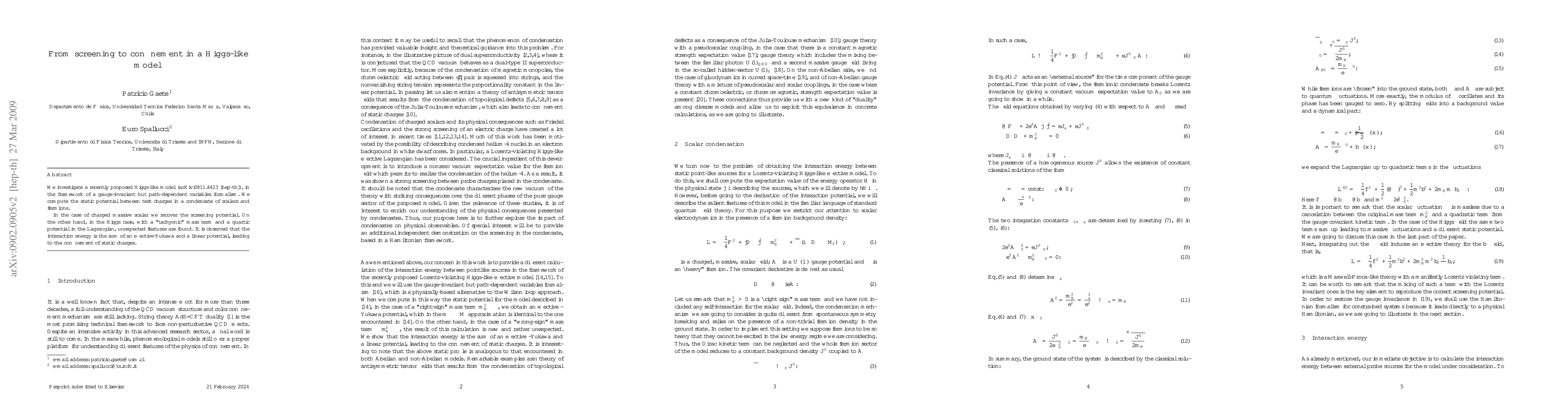 We investigate a recently proposed Higgs-like model (arXiv:0811.4423 [hep-th]), in the framework of a gauge-invariant but path-dependent variables formalism. We compute the static potential between test charges in a condensate of scalars and fermions. In the case of charged massive scalar we recover the screening potential. On the other hand, in the Higgs case, with a "tachyonic" mass term and a quartic potential in the Lagrangian, unexpected features are found. It is observed that the interaction energy is the sum of an effective-Yukawa and a linear potential, leading to the confinement of static charges.