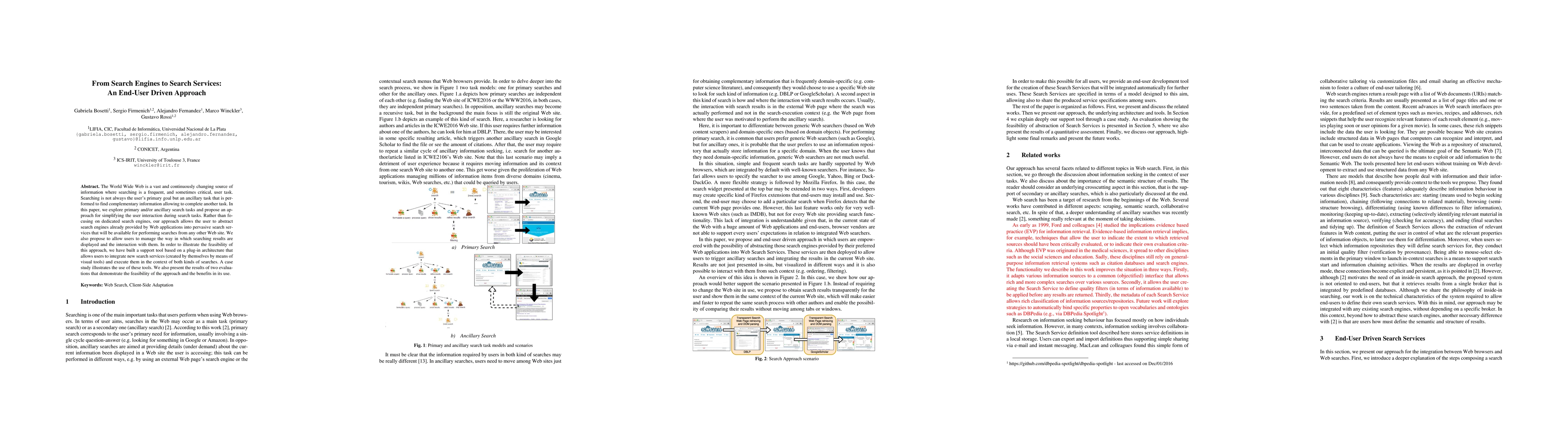 The World Wide Web is a vast and continuously changing source of information where searching is a frequent, and sometimes critical, user task. Searching is not always the user's primary goal but an ancillary task that is performed to find complementary information allowing to complete another task. In this paper, we explore primary and/or ancillary search tasks and propose an approach for simplifying the user interaction during search tasks. Rather than fo-cusing on dedicated search engines, our approach allows the user to abstract search engines already provided by Web applications into pervasive search services that will be available for performing searches from any other Web site. We also propose to allow users to manage the way in which searching results are displayed and the interaction with them. In order to illustrate the feasibility of this approach, we have built a support tool based on a plug-in architecture that allows users to integrate new search services (created by themselves by means of visual tools) and execute them in the context of both kinds of searches. A case study illustrates the use of these tools. We also present the results of two evaluations that demonstrate the feasibility of the approach and the benefits in its use.