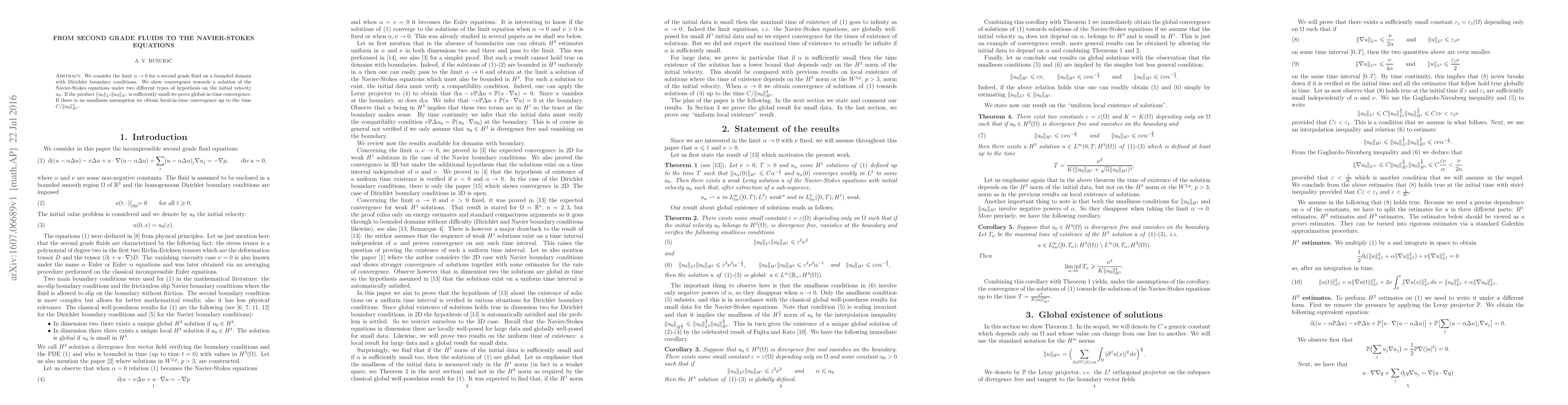 We consider the limit $\alpha\to0$ for a second grade fluid on a bounded domain with Dirichlet boundary conditions. We show convergence towards a solution of the Navier-Stokes equations under two different types of hypothesis on the initial velocity $u_0$. If the product $\|u_0\|_{L^2}\|u_0\|_{H^1}$ is sufficiently small we prove global-in-time convergence. If there is no smallness assumption we obtain local-in-time convergence up to the time $C/\|u_0\|_{H^1}^4$.