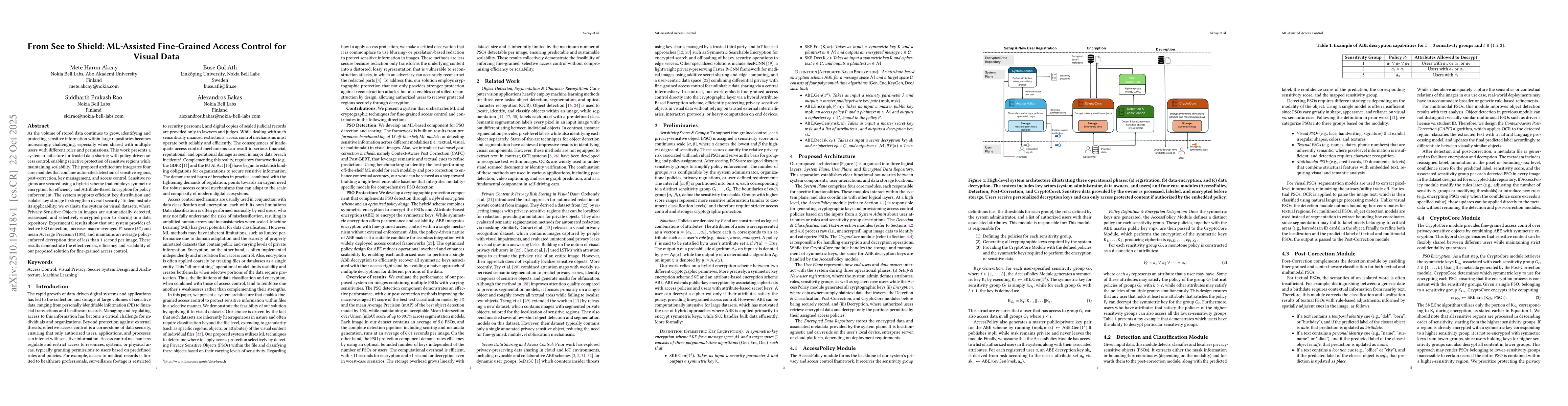 The integration of machine learning for automated sensitive region detection with policy-driven access control represents a novel approach to fine-grained visual data protection.