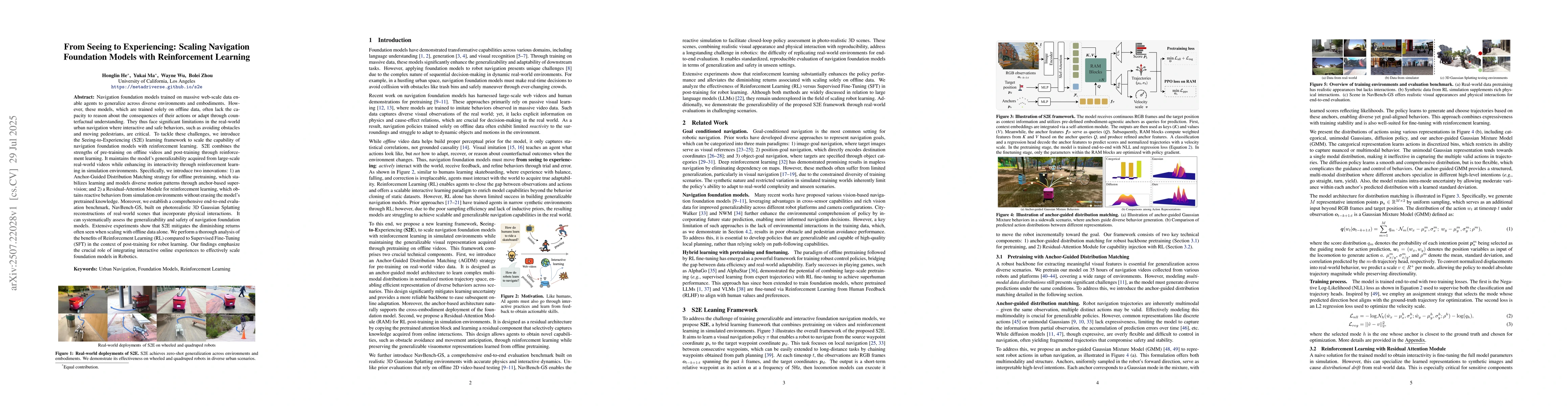 Navigation foundation models trained on massive webscale data enable agents to generalize across diverse environments and embodiments. However, these models trained solely on offline data, often lack the capacity to reason about the consequences of their actions or adapt through counterfactual understanding. They thus face significant limitations in the real-world urban navigation where interactive and safe behaviors, such as avoiding obstacles and moving pedestrians, are critical. To tackle these challenges, we introduce the Seeing-to-Experiencing framework to scale the capability of navigation foundation models with reinforcement learning. S2E combines the strengths of pre-training on videos and post-training through RL. It maintains the generalizability acquired from large-scale real-world videos while enhancing its interactivity through RL in simulation environments. Specifically, we introduce two innovations: an Anchor-Guided Distribution Matching strategy, which stabilizes learning and models diverse motion patterns through anchor-based supervision; and a Residual-Attention Module, which obtains reactive behaviors from simulation environments without erasing the model's pretrained knowledge. Moreover, we establish a comprehensive end-to-end evaluation benchmark, NavBench-GS, built on photorealistic 3DGS reconstructions of real-world scenes that incorporate physical interactions. It can systematically assess the generalizability and safety of navigation foundation models. Extensive experiments show that S2E mitigates the diminishing returns often seen when scaling with offline data alone. We perform a thorough analysis of the benefits of Reinforcement Learning compared to Supervised Fine-Tuning in the context of post-training for robot learning. Our findings emphasize the crucial role of integrating interactive online experiences to effectively scale foundation models in Robotics.