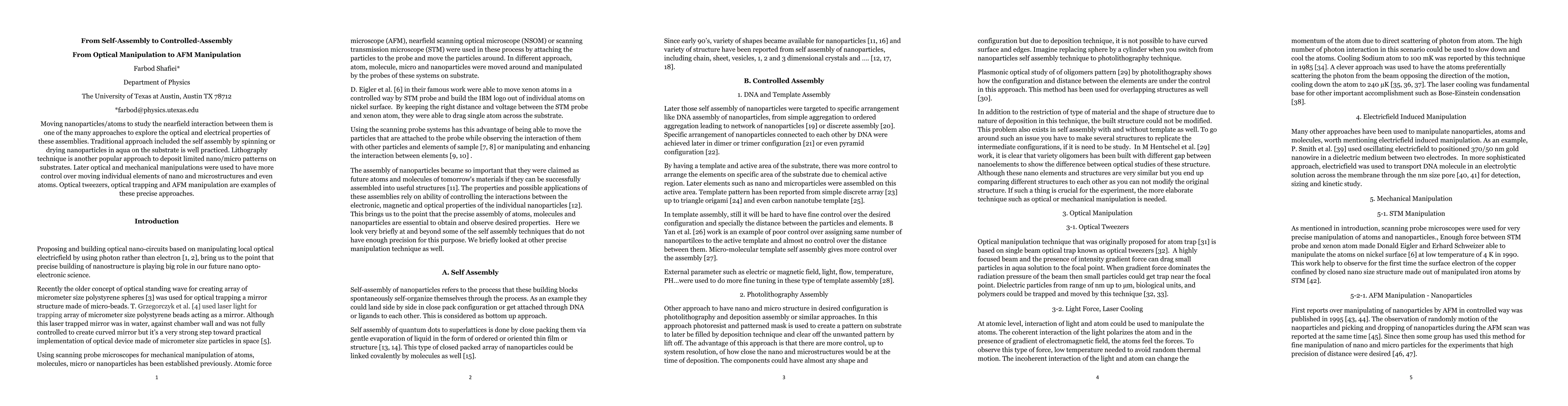 Moving nanoparticles/atoms to study the nearfield interaction between them is one of the many approaches to explore the optical and electrical properties of these assemblies. Traditional approach included the self assembly by spinning or drying nanoparticles in aqua on the substrate is well practiced. Lithography technique is another popular approach to deposit limited nano/micro patterns on substrates. Later optical and mechanical manipulations were used to have more control over moving individual elements of nano and microstructures and even atoms. Optical tweezers, optical trapping and AFM manipulation are examples of these precise approaches.