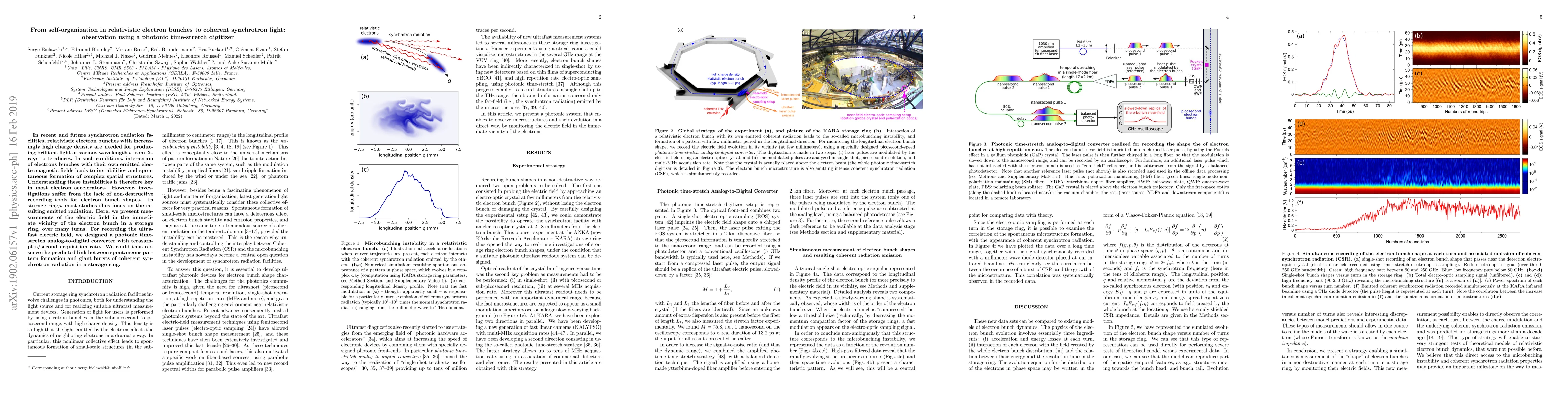 This paper investigates the self-organization of relativistic electron bunches and their emitted electromagnetic fields, using a photonic time-stretch digitizer to capture the ultrafast electric field in storage rings. The study reveals the connection between instabilities in electron bunches and bursts of coherent synchrotron radiation.