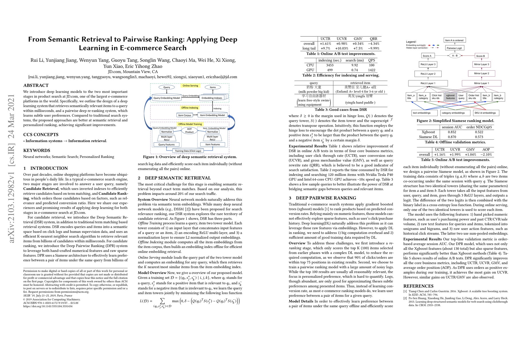 This paper presents deep learning models for semantic retrieval and pairwise ranking in JD.com's e-commerce search, achieving faster and more relevant results compared to traditional systems. The proposed methods significantly enhance both semantic retrieval and personalized ranking.