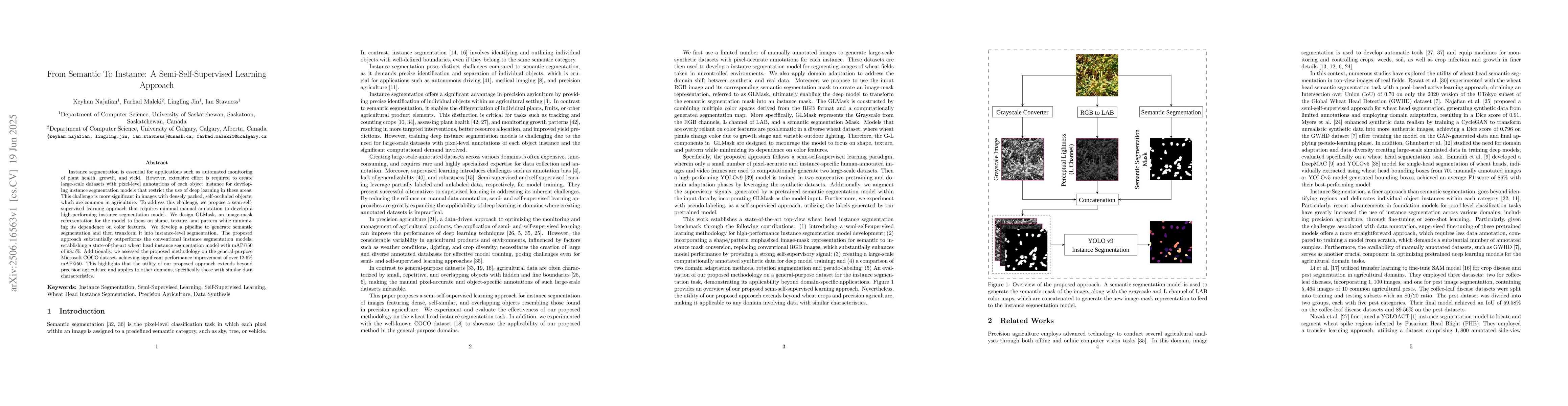 Instance segmentation is essential for applications such as automated monitoring of plant health, growth, and yield. However, extensive effort is required to create large-scale datasets with pixel-level annotations of each object instance for developing instance segmentation models that restrict the use of deep learning in these areas. This challenge is more significant in images with densely packed, self-occluded objects, which are common in agriculture. To address this challenge, we propose a semi-self-supervised learning approach that requires minimal manual annotation to develop a high-performing instance segmentation model. We design GLMask, an image-mask representation for the model to focus on shape, texture, and pattern while minimizing its dependence on color features. We develop a pipeline to generate semantic segmentation and then transform it into instance-level segmentation. The proposed approach substantially outperforms the conventional instance segmentation models, establishing a state-of-the-art wheat head instance segmentation model with mAP@50 of 98.5%. Additionally, we assessed the proposed methodology on the general-purpose Microsoft COCO dataset, achieving a significant performance improvement of over 12.6% mAP@50. This highlights that the utility of our proposed approach extends beyond precision agriculture and applies to other domains, specifically those with similar data characteristics.