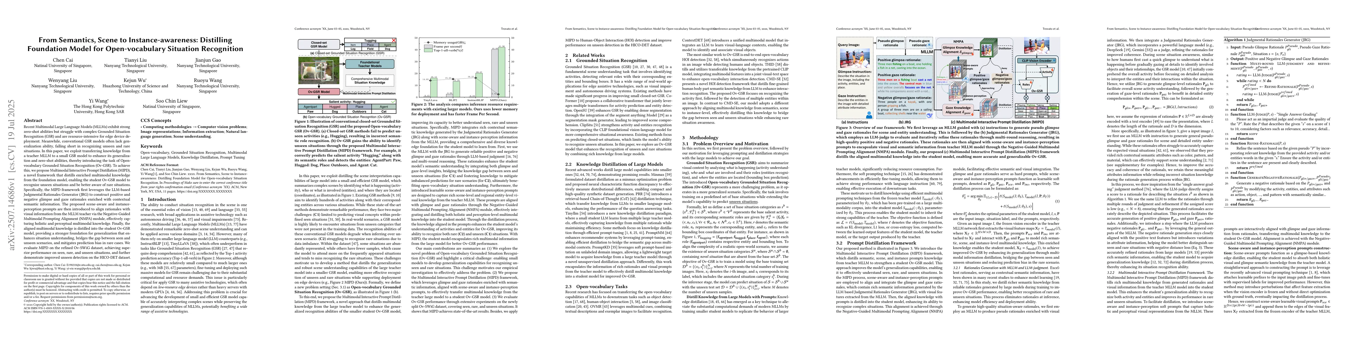 Recent Multimodal Large Language Models (MLLMs) exhibit strong zero-shot abilities but struggle with complex Grounded Situation Recognition (GSR) and are resource-intensive for edge device deployment. Meanwhile, conventional GSR models often lack generalization ability, falling short in recognizing unseen and rare situations. In this paper, we exploit transferring knowledge from a teacher MLLM to a small GSR model to enhance its generalization and zero-shot abilities, thereby introducing the task of Open-vocabulary Grounded Situation Recognition (Ov-GSR). To achieve this, we propose Multimodal Interactive Prompt Distillation (MIPD), a novel framework that distills enriched multimodal knowledge from the foundation model, enabling the student Ov-GSR model to recognize unseen situations and be better aware of rare situations. Specifically, the MIPD framework first leverages the LLM-based Judgmental Rationales Generator (JRG) to construct positive and negative glimpse and gaze rationales enriched with contextual semantic information. The proposed scene-aware and instance-perception prompts are then introduced to align rationales with visual information from the MLLM teacher via the Negative-Guided Multimodal Prompting Alignment (NMPA) module, effectively capturing holistic and perceptual multimodal knowledge. Finally, the aligned multimodal knowledge is distilled into the student Ov-GSR model, providing a stronger foundation for generalization that enhances situation understanding, bridges the gap between seen and unseen scenarios, and mitigates prediction bias in rare cases. We evaluate MIPD on the refined Ov-SWiG dataset, achieving superior performance on seen, rare, and unseen situations, and further demonstrate improved unseen detection on the HICO-DET dataset.