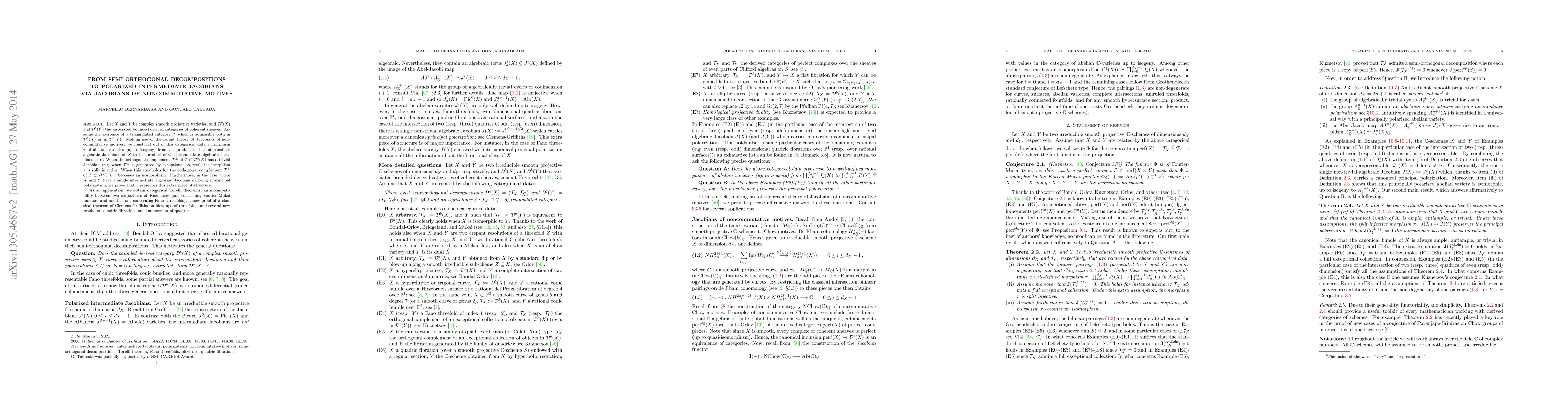 Let X and Y be complex smooth projective varieties, and D^b(X) and D^b(Y) the associated bounded derived categories of coherent sheaves. Assume the existence of a triangulated category T which is admissible both in D^b(X) as in D^b(Y). Making use of the recent theory of Jacobians of noncommutative motives, we construct out of this categorical data a morphism t of abelian varieties (up to isogeny) from the product of the intermediate algebraic Jacobians of X to the product of the intermediate algebraic Jacobians of Y. When the orthogonal complement of T in D^b(X) has a trivial Jacobian (e.g. when it is generated by exceptional objects), the morphism t is split injective. When this also holds for the orthogonal complement of T in D^b(Y), t becomes an isomorphism. Furthermore, in the case where X and Y have a single intermediate algebraic Jacobian carrying a principal polarization, we prove that the morphism t preserves this extra structure. As an application, we obtain categorical Torelli theorems, an incompatibility between two conjectures of Kuznetsov (one concerning Fourier-Mukai functors and another one concerning Fano threefolds), a new proof of a classical theorem of Clemens-Griffiths on blow-ups of threefolds, and several new results on quadric fibrations and intersection of quadrics.