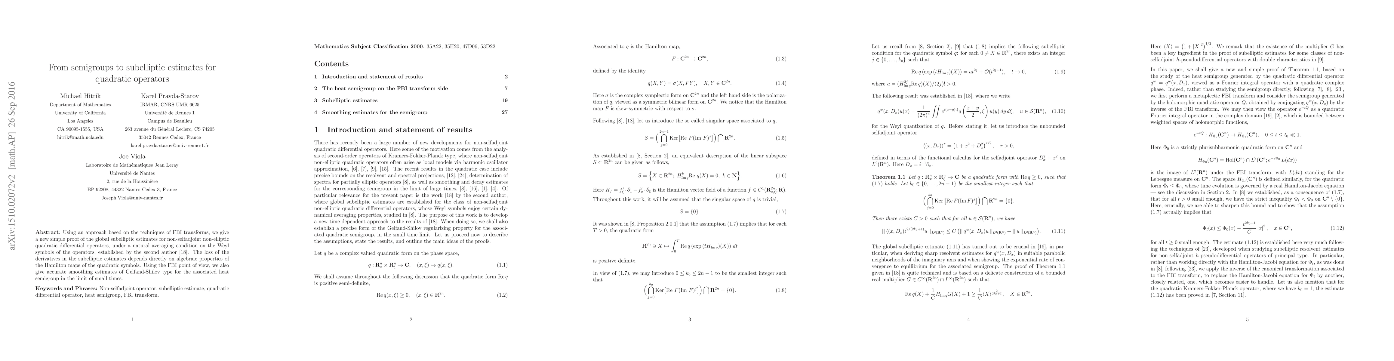 This paper provides a new proof of global subelliptic estimates for non-selfadjoint, non-elliptic quadratic differential operators using FBI transforms, with derivative loss tied to algebraic properties of Hamilton maps. It also offers precise smoothing estimates for the associated heat semigroup at small times.