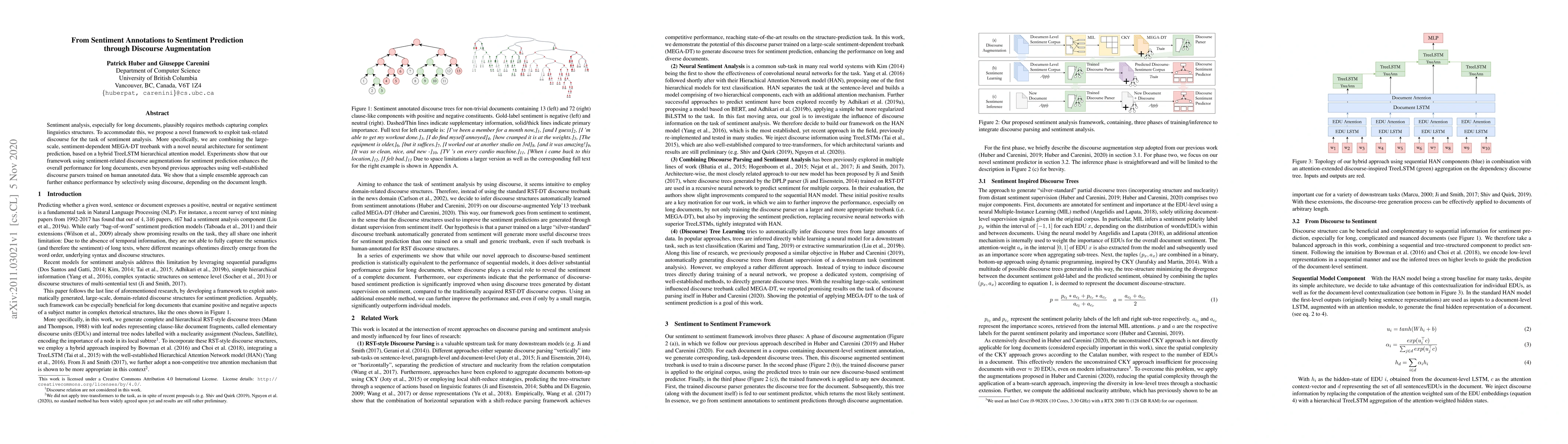 Sentiment analysis, especially for long documents, plausibly requires methods capturing complex linguistics structures. To accommodate this, we propose a novel framework to exploit task-related discourse for the task of sentiment analysis. More specifically, we are combining the large-scale, sentiment-dependent MEGA-DT treebank with a novel neural architecture for sentiment prediction, based on a hybrid TreeLSTM hierarchical attention model. Experiments show that our framework using sentiment-related discourse augmentations for sentiment prediction enhances the overall performance for long documents, even beyond previous approaches using well-established discourse parsers trained on human annotated data. We show that a simple ensemble approach can further enhance performance by selectively using discourse, depending on the document length.