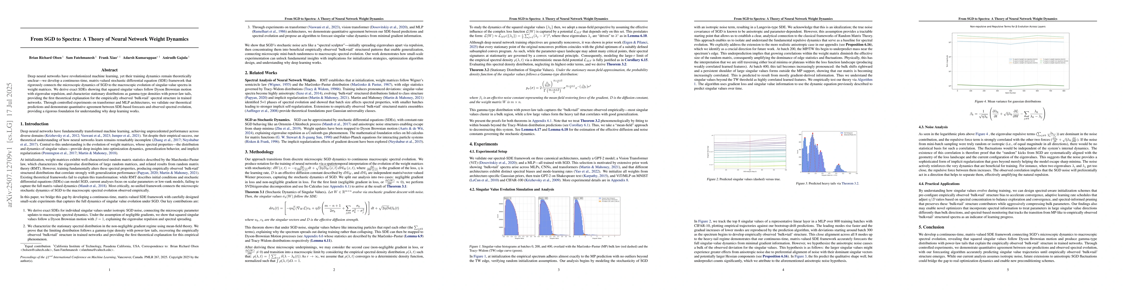 Deep neural networks have revolutionized machine learning, yet their training dynamics remain theoretically unclear-we develop a continuous-time, matrix-valued stochastic differential equation (SDE) framework that rigorously connects the microscopic dynamics of SGD to the macroscopic evolution of singular-value spectra in weight matrices. We derive exact SDEs showing that squared singular values follow Dyson Brownian motion with eigenvalue repulsion, and characterize stationary distributions as gamma-type densities with power-law tails, providing the first theoretical explanation for the empirically observed 'bulk+tail' spectral structure in trained networks. Through controlled experiments on transformer and MLP architectures, we validate our theoretical predictions and demonstrate quantitative agreement between SDE-based forecasts and observed spectral evolution, providing a rigorous foundation for understanding why deep learning works.