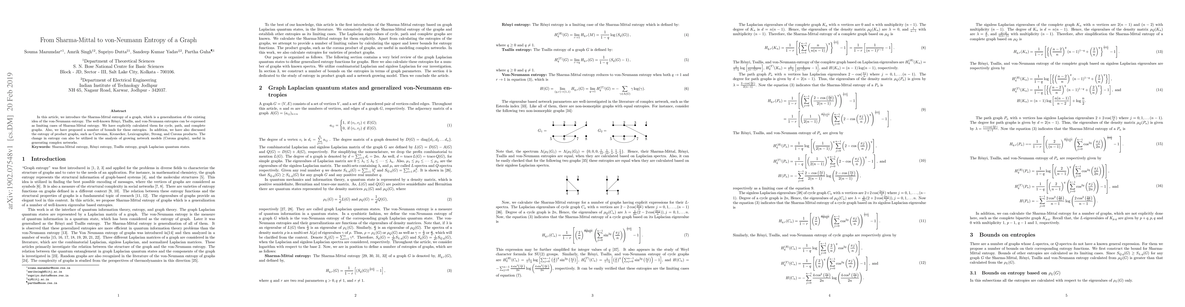 This paper generalizes the concept of von-Neumann entropy to the Sharma-Mittal entropy of a graph, showing its applicability to various graph types and products. It also proposes new bounds for these entropies and discusses their utility in analyzing growing network models.
