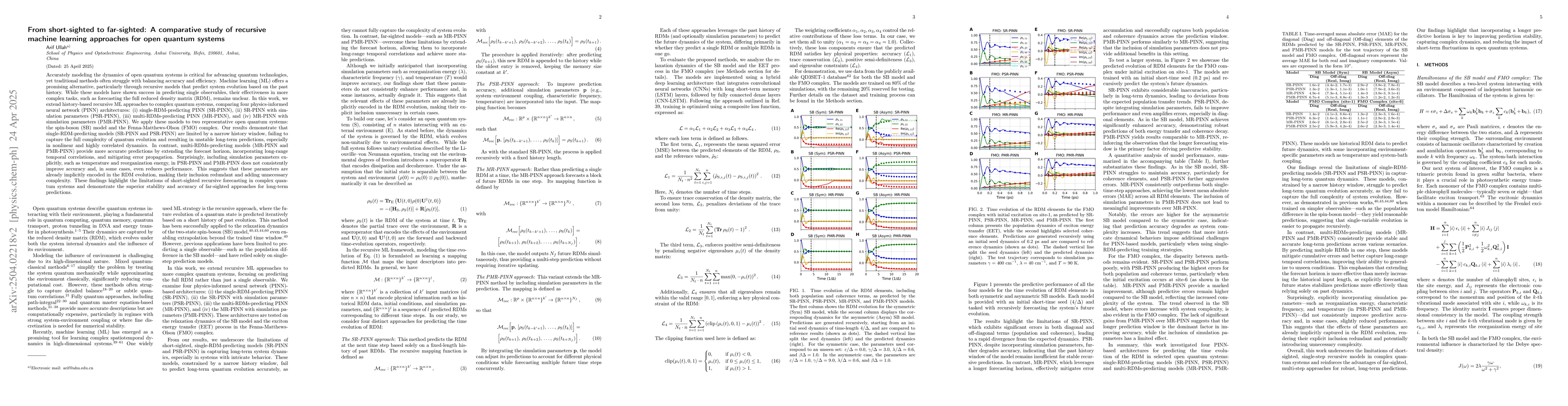 Accurately modeling open quantum system dynamics is crucial for advancing quantum technologies, yet traditional methods struggle to balance accuracy and efficiency. Machine learning (ML) provides a promising alternative, particularly through recursive models that predict system evolution based on past history. While these models have shown success in predicting single observables, their effectiveness in more complex tasks, such as forecasting the full reduced density matrix (RDM), remains unclear. We extend history-based recursive ML approaches to complex quantum systems, comparing four physics-informed neural network (PINN) architectures: (i) single-RDM-predicting PINN (SR-PINN), (ii) SR-PINN with simulation parameters (PSR-PINN), (iii) multi-RDMs-predicting PINN (MR-PINN), and (iv) MR-PINN with simulation parameters (PMR-PINN). These models are applied to the spin-boson (SB) model and the Fenna-Matthews-Olson (FMO) complex. Our results show that SR-PINN and PSR-PINN, constrained by a narrow history window, fail to capture complex quantum evolution, leading to unstable long-term predictions, especially in nonlinear and highly correlated dynamics. In contrast, MR-PINN and PMR-PINN improve accuracy by extending the forecast horizon, incorporating long-range correlations, and reducing error propagation. Surprisingly, explicitly including simulation parameters such as temperature and reorganization energy in PSR-PINN and PMR-PINN does not consistently enhance accuracy and can even reduce performance, suggesting that these effects are already encoded in the RDM evolution. These findings highlight the limitations of short-sighted recursive forecasting and demonstrate the superior stability and accuracy of far-sighted approaches for long-term predictions.