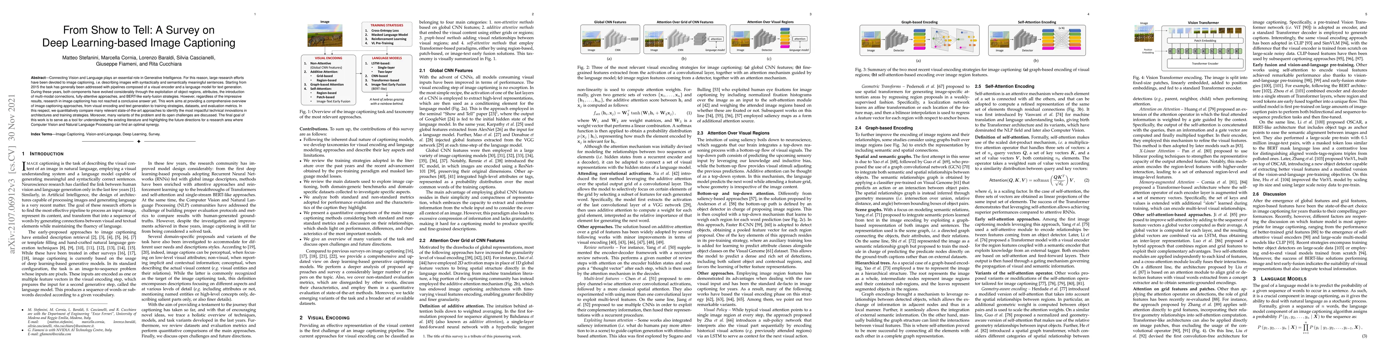 Connecting Vision and Language plays an essential role in Generative Intelligence. For this reason, large research efforts have been devoted to image captioning, i.e. describing images with syntactically and semantically meaningful sentences. Starting from 2015 the task has generally been addressed with pipelines composed of a visual encoder and a language model for text generation. During these years, both components have evolved considerably through the exploitation of object regions, attributes, the introduction of multi-modal connections, fully-attentive approaches, and BERT-like early-fusion strategies. However, regardless of the impressive results, research in image captioning has not reached a conclusive answer yet. This work aims at providing a comprehensive overview of image captioning approaches, from visual encoding and text generation to training strategies, datasets, and evaluation metrics. In this respect, we quantitatively compare many relevant state-of-the-art approaches to identify the most impactful technical innovations in architectures and training strategies. Moreover, many variants of the problem and its open challenges are discussed. The final goal of this work is to serve as a tool for understanding the existing literature and highlighting the future directions for a research area where Computer Vision and Natural Language Processing can find an optimal synergy.