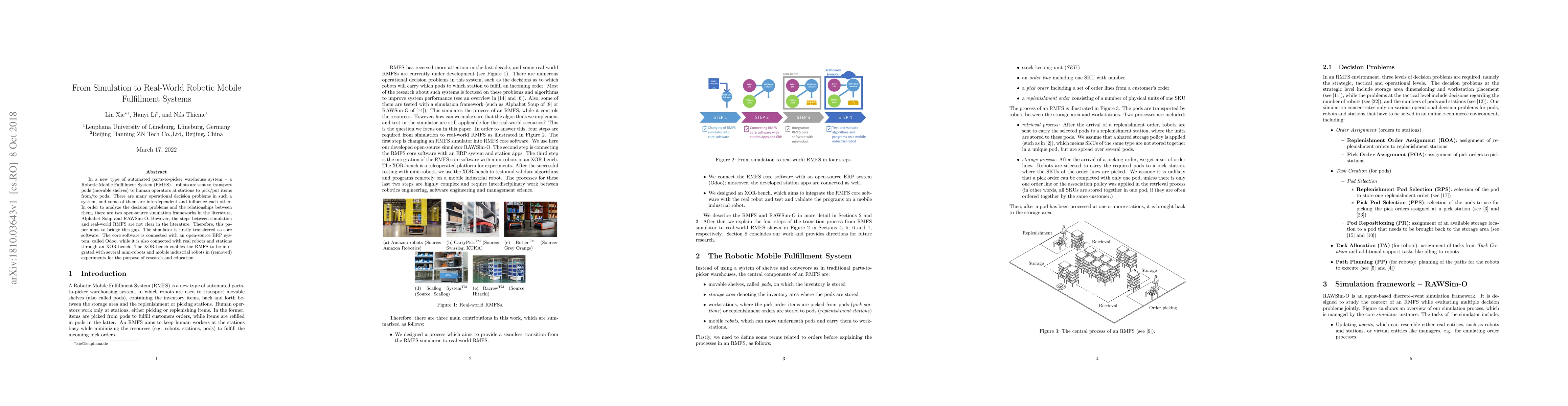 In a new type of automated parts-to-picker warehouse system - a Robotic Mobile Fulfillment System (RMFS) - robots are sent to transport pods (movable shelves) to human operators at stations to pick/put items from/to pods. There are many operational decision problems in such a system, and some of them are interdependent and influence each other. In order to analyze the decision problems and the relationships between them, there are two open-source simulation frameworks in the literature, Alphabet Soup and RAWSim-O. However, the steps between simulation and real-world RMFS are not clear in the literature. Therefore, this paper aims to bridge this gap. The simulator is firstly transferred as core software. The core software is connected with an open-source ERP system, called Odoo, while it is also connected with real robots and stations through an XOR-bench. The XOR-bench enables the RMFS to be integrated with several mini-robots and mobile industrial robots in (removed) experiments for the purpose of research and education.