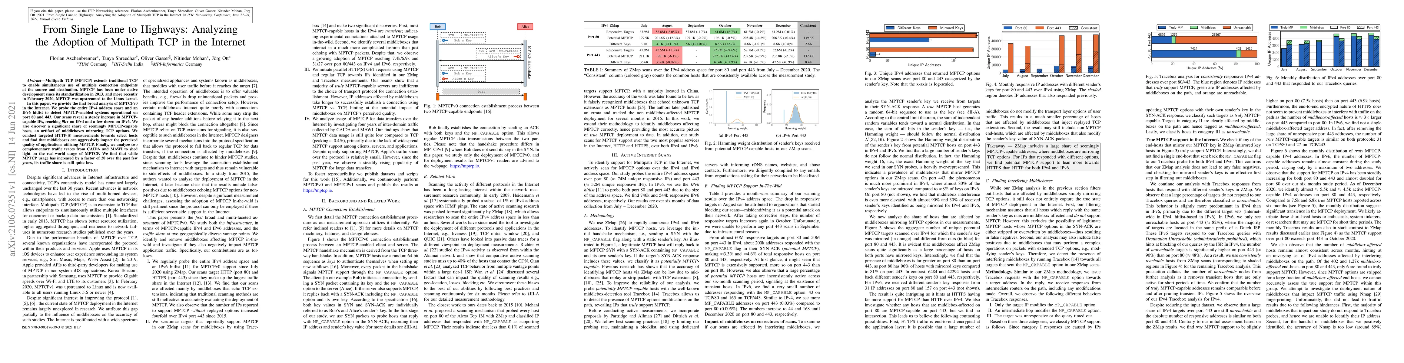 This paper analyzes the adoption of Multipath TCP (MPTCP) in the Internet, revealing a steady increase in MPTCP-capable IPs, with over 9k on IPv4 and a few dozen on IPv6. Despite the rise, MPTCP's traffic share remains low, and middleboxes significantly impact its application performance.