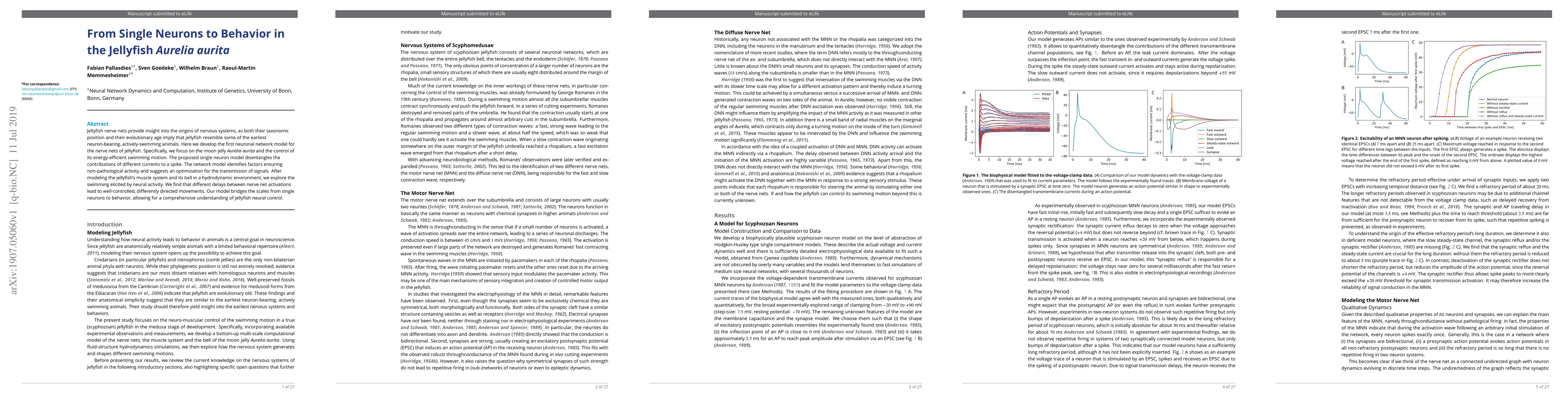 This paper develops a neuronal network model for the jellyfish Aurelia aurita's nerve nets to understand the control of its swimming motion. It identifies factors ensuring non-pathological activity and optimizes signal transmission, bridging the gap from single neurons to behavioral control.