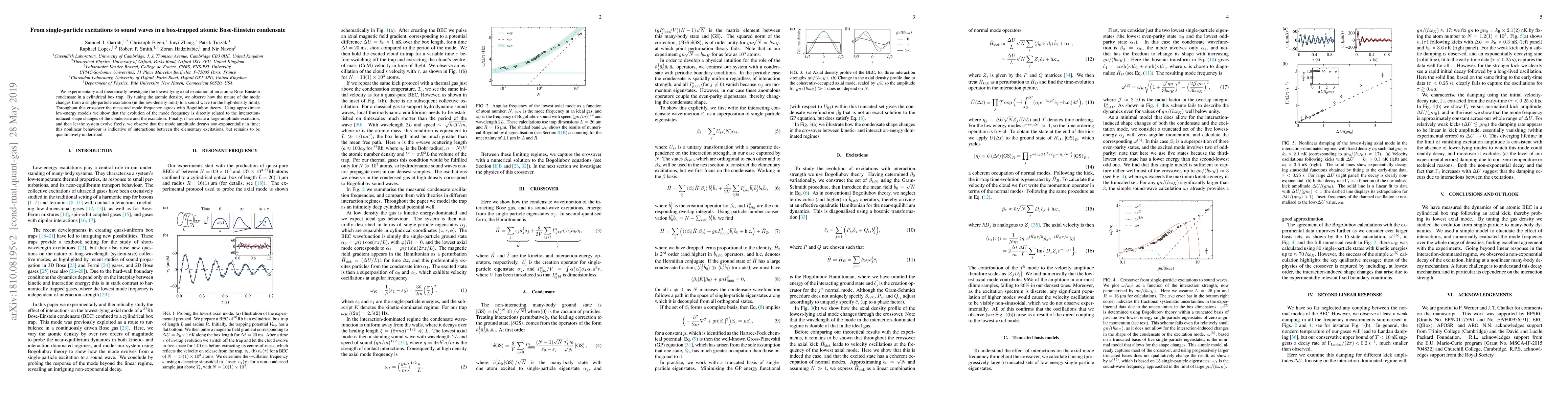 This paper investigates the transition from single-particle excitations to sound waves in a box-trapped atomic Bose-Einstein condensate, showing that mode frequency aligns with Bogoliubov theory across density changes. Nonlinear, non-exponential decay of large-amplitude excitations suggests interaction-driven effects yet to be fully understood.