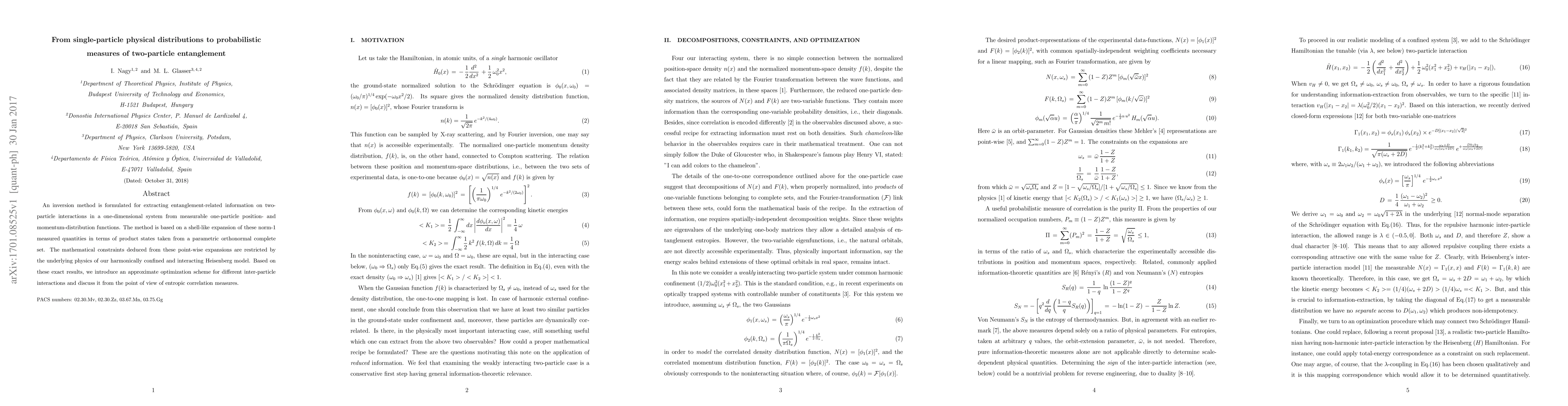 An inversion method is formulated for extracting entanglement-related information on two-particle interactions in a one-dimensional system from measurable one-particle position- and momentum-distribution functions. The method is based on a shell-like expansion of these norm-1 measured quantities in terms of product states taken from a parametric orthonormal complete set. The mathematical constraints deduced from these point-wise expansions are restricted by the underlying physics of our harmonically confined and interacting Heisenberg model. Based on these exact results, we introduce an approximate optimization scheme for different inter-particle interactions and discuss it from the point of view of entropic correlation measures.
