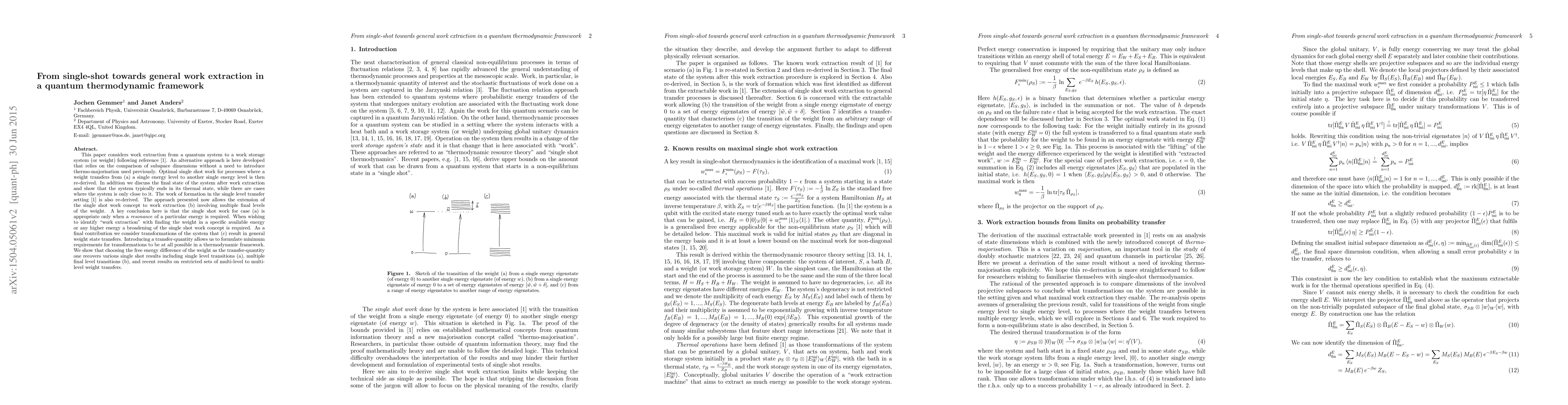 This paper develops a new method for extracting work from quantum systems without using thermo-majorisation, focusing on the optimal single-shot work for energy level transfers. It extends the concept to multiple final energy levels and discusses the final state of the system, often thermal but sometimes close to it. The work of formation is re-evaluated, and a transfer-quantity is introduced for general weight state transformations, showing its applicability to various scenarios.