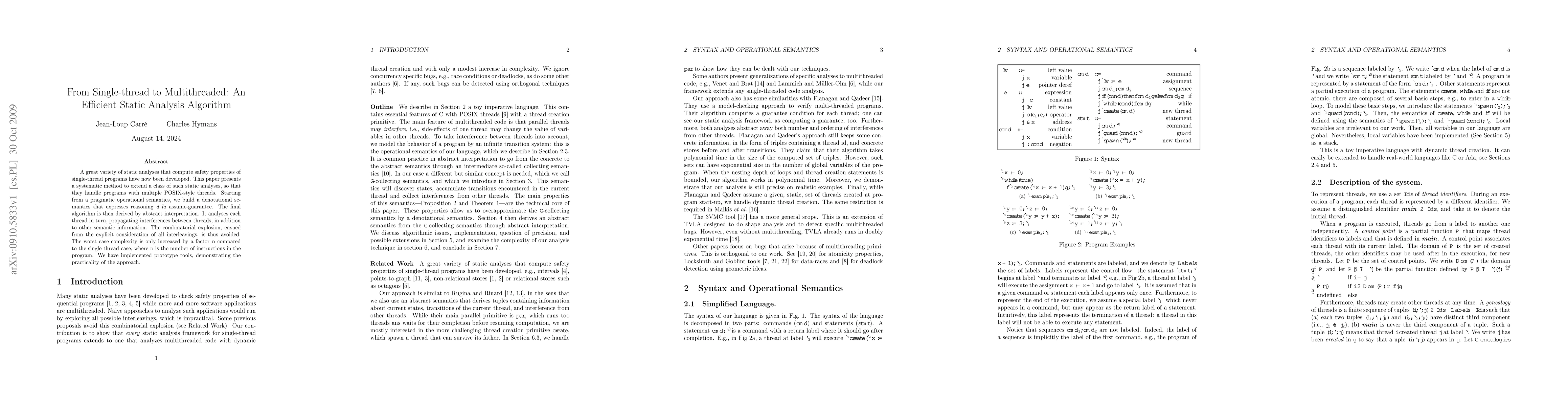 This paper proposes an efficient static analysis method to extend single-thread analyses to handle multithreaded programs, avoiding combinatorial explosion through abstract interpretation. The approach increases complexity by a factor of n, where n is the number of program instructions, and has been demonstrated through prototype tools.