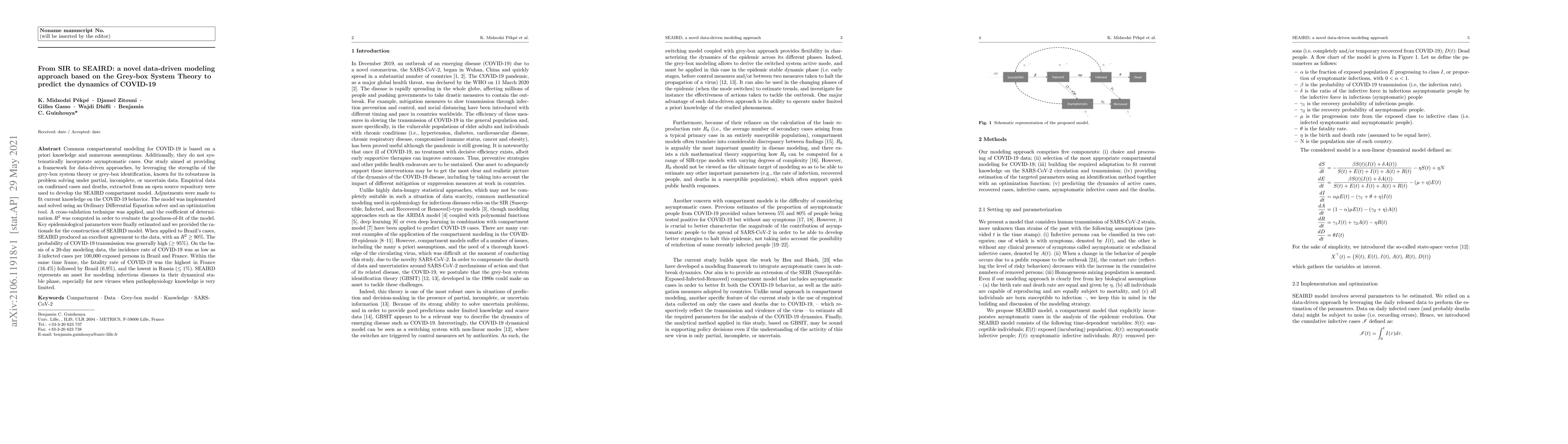 Common compartmental modeling for COVID-19 is based on a priori knowledge and numerous assumptions. Additionally, they do not systematically incorporate asymptomatic cases. Our study aimed at providing a framework for data-driven approaches, by leveraging the strengths of the grey-box system theory or grey-box identification, known for its robustness in problem solving under partial, incomplete, or uncertain data. Empirical data on confirmed cases and deaths, extracted from an open source repository were used to develop the SEAIRD compartment model. Adjustments were made to fit current knowledge on the COVID-19 behavior. The model was implemented and solved using an Ordinary Differential Equation solver and an optimization tool. A cross-validation technique was applied, and the coefficient of determination $R^2$ was computed in order to evaluate the goodness-of-fit of the model. %to the data. Key epidemiological parameters were finally estimated and we provided the rationale for the construction of SEAIRD model. When applied to Brazil's cases, SEAIRD produced an excellent agreement to the data, with an %coefficient of determination $R^2$ $\geq 90\%$. The probability of COVID-19 transmission was generally high ($\geq 95\%$). On the basis of a 20-day modeling data, the incidence rate of COVID-19 was as low as 3 infected cases per 100,000 exposed persons in Brazil and France. Within the same time frame, the fatality rate of COVID-19 was the highest in France (16.4\%) followed by Brazil (6.9\%), and the lowest in Russia ($\leq 1\%$). SEAIRD represents an asset for modeling infectious diseases in their dynamical stable phase, especially for new viruses when pathophysiology knowledge is very limited.