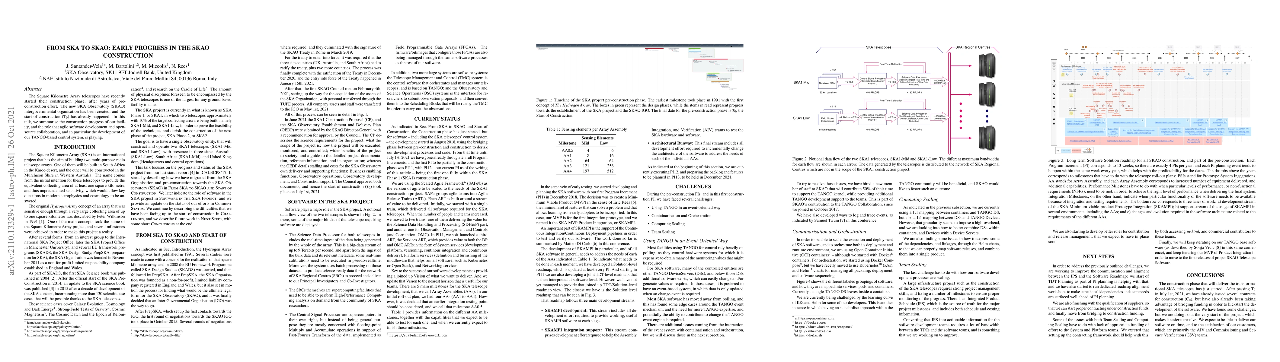 The paper discusses the commencement of the Square Kilometre Array (SKA) telescopes' construction phase and highlights the formation of the SKA Observatory (SKAO) intergovernmental organization. It emphasizes the role of agile software development and open-source collaboration, particularly the TANGO-based control system, in the construction progress.