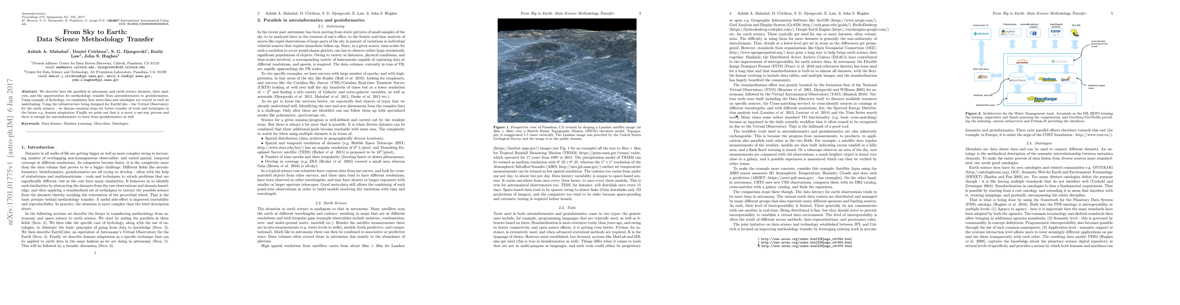 We describe here the parallels in astronomy and earth science datasets, their analyses, and the opportunities for methodology transfer from astroinformatics to geoinformatics. Using example of hydrology, we emphasize how meta-data and ontologies are crucial in such an undertaking. Using the infrastructure being designed for EarthCube - the Virtual Observatory for the earth sciences - we discuss essential steps for better transfer of tools and techniques in the future e.g. domain adaptation. Finally we point out that it is never a one-way process and there is enough for astroinformatics to learn from geoinformatics as well.