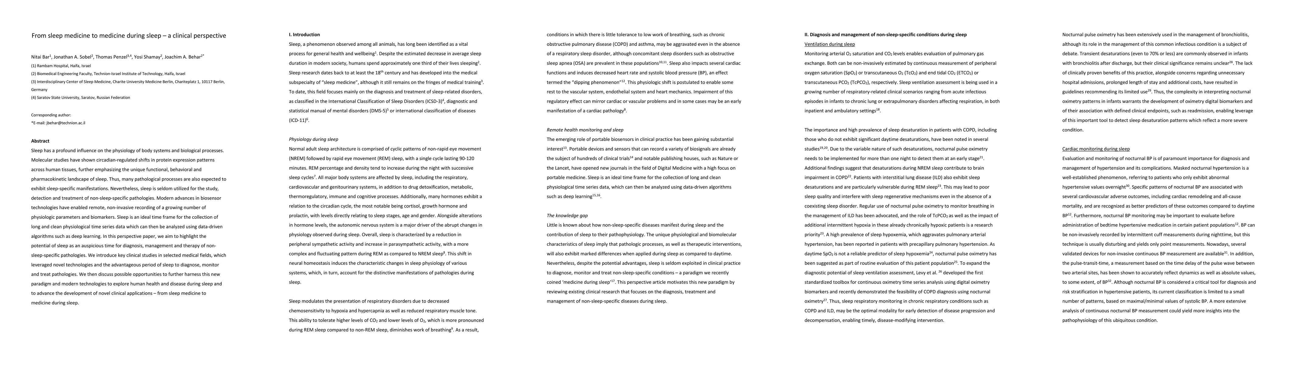 This paper explores the potential of sleep as a unique window for diagnosing, monitoring, and treating non-sleep-related pathologies, leveraging modern biosensor technologies and data-driven algorithms. It highlights clinical studies using sleep periods to advance medical applications beyond traditional sleep medicine.
