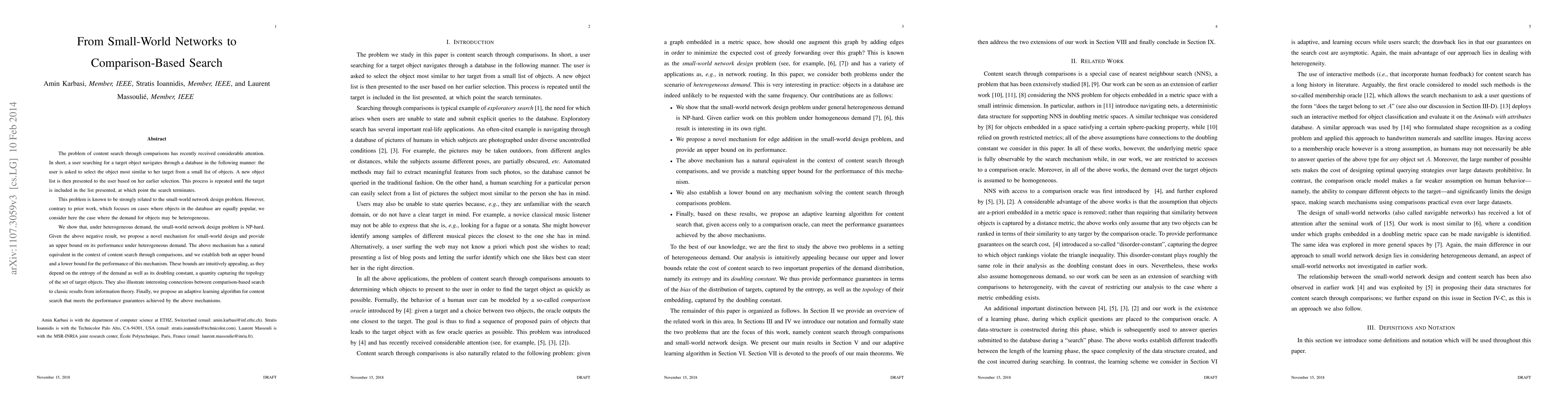 The problem of content search through comparisons has recently received considerable attention. In short, a user searching for a target object navigates through a database in the following manner: the user is asked to select the object most similar to her target from a small list of objects. A new object list is then presented to the user based on her earlier selection. This process is repeated until the target is included in the list presented, at which point the search terminates. This problem is known to be strongly related to the small-world network design problem. However, contrary to prior work, which focuses on cases where objects in the database are equally popular, we consider here the case where the demand for objects may be heterogeneous. We show that, under heterogeneous demand, the small-world network design problem is NP-hard. Given the above negative result, we propose a novel mechanism for small-world design and provide an upper bound on its performance under heterogeneous demand. The above mechanism has a natural equivalent in the context of content search through comparisons, and we establish both an upper bound and a lower bound for the performance of this mechanism. These bounds are intuitively appealing, as they depend on the entropy of the demand as well as its doubling constant, a quantity capturing the topology of the set of target objects. They also illustrate interesting connections between comparison-based search to classic results from information theory. Finally, we propose an adaptive learning algorithm for content search that meets the performance guarantees achieved by the above mechanisms.