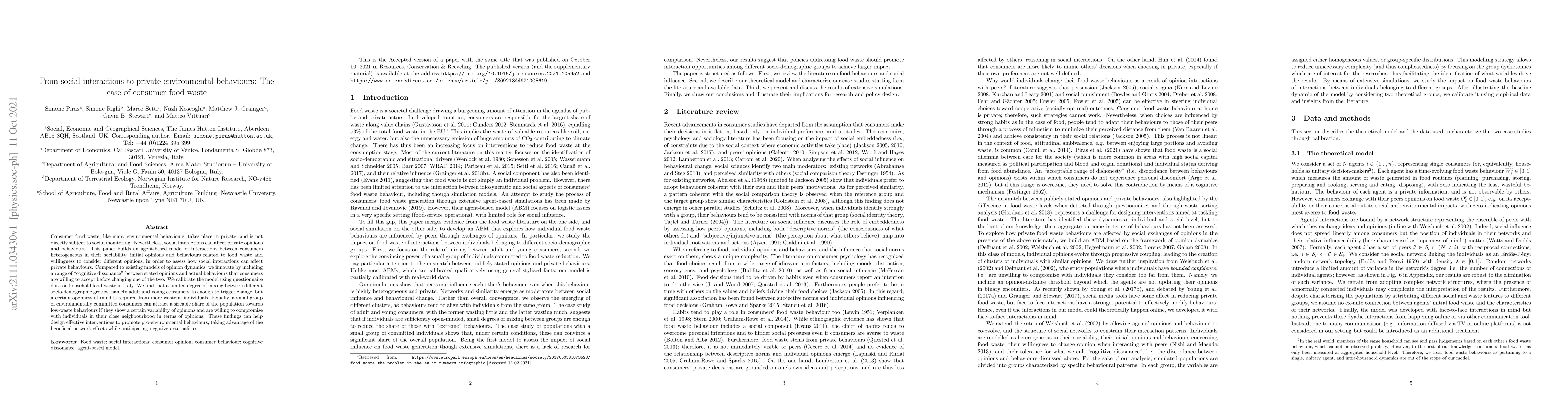 This paper uses an agent-based model to explore how social interactions influence private consumer food waste behaviours. It finds that even limited mixing between socio-demographic groups can trigger behavioural changes, especially if more wasteful individuals are open to new opinions. A small group of environmentally committed individuals can promote low-waste behaviours if they are flexible and willing to compromise.